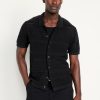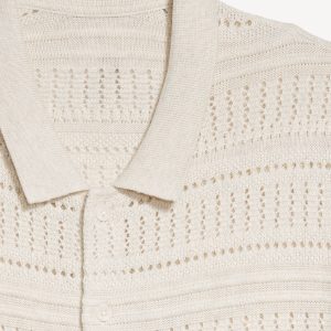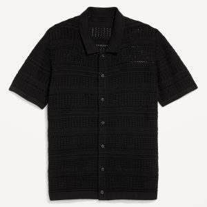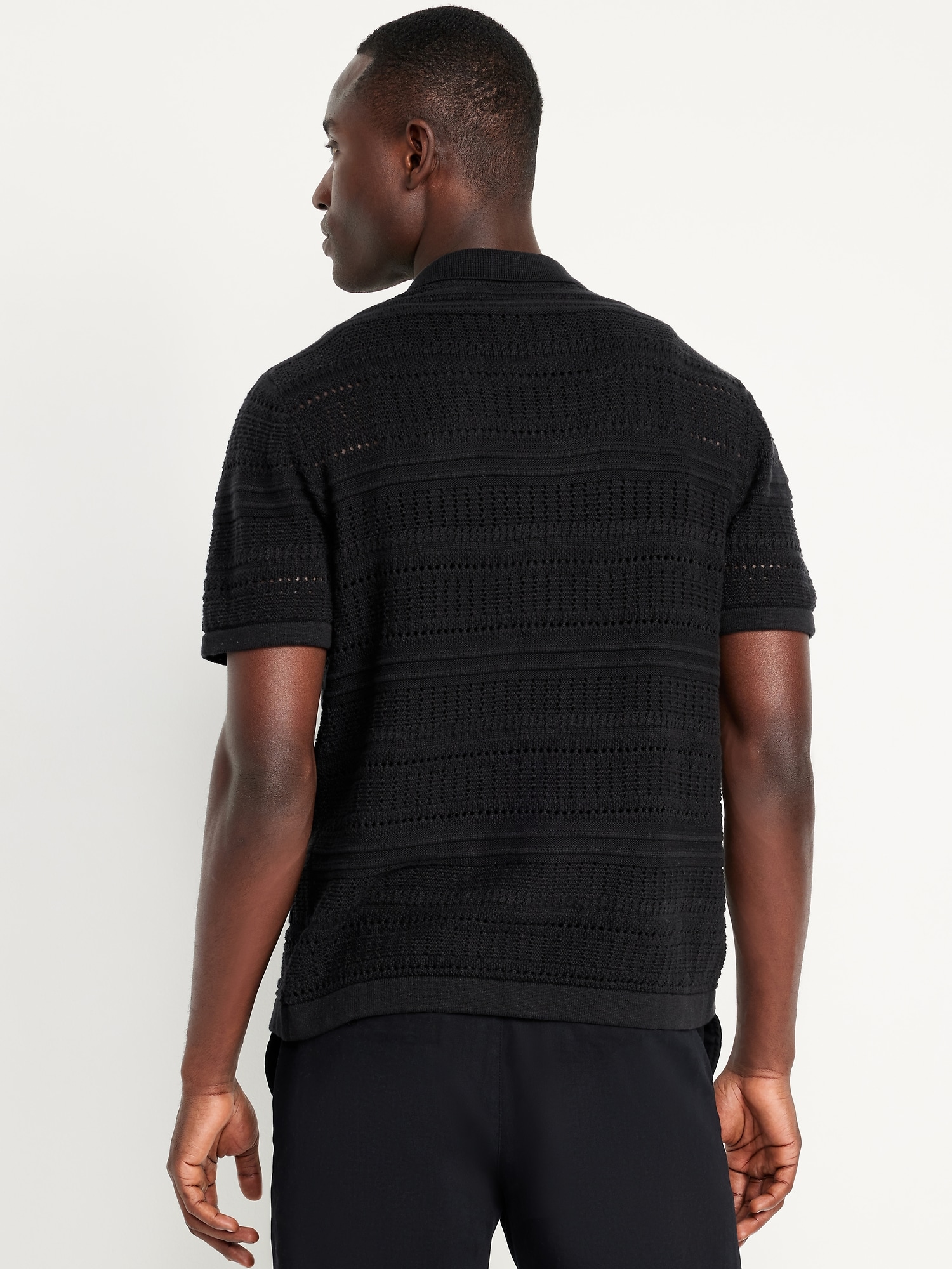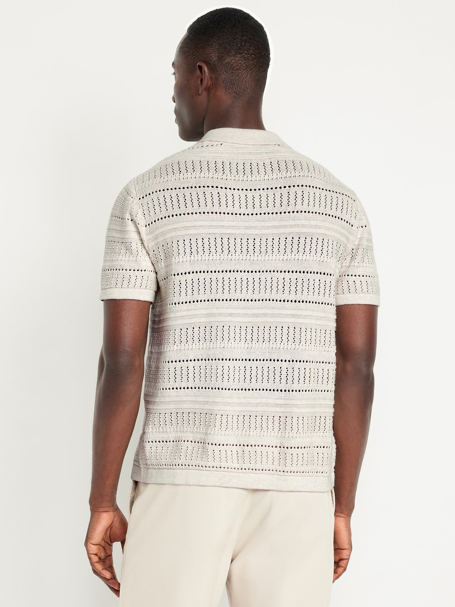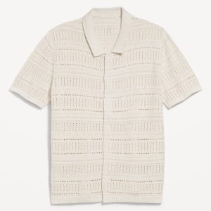 Open-Stitch Sweater: spread collar, short sleeves, full-button front, textured patterns vary, #762317