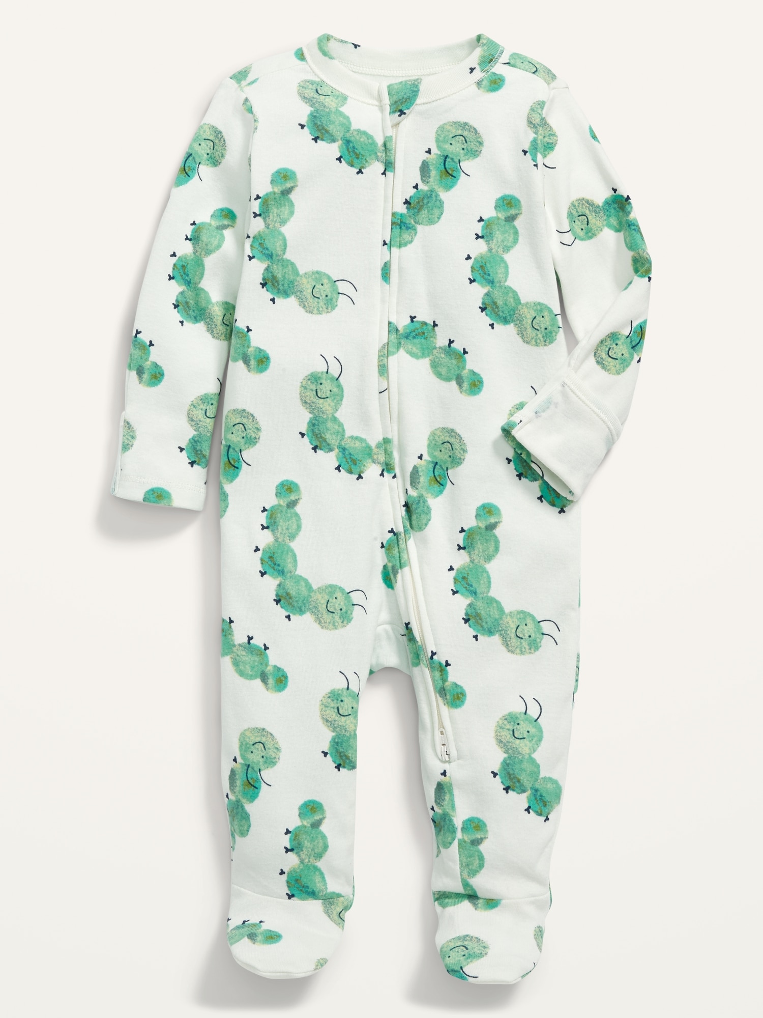 Unisex Caterpillar Print Sleep & Play 2-Way Zip Footed One-Piece for Baby: This footed one-piece is totally adorable & unisex, too. Wearable & shareable for baby girl and baby boy!, Rib-knit crew neck., Long sleeves., Fold-over mittens at each sleeve flip over to keep baby’s hands warm and protect tender skin from scratches. Genius!, Reversible two-way zipper unzips from the bottom for quick diaper access. Baby changing just got so much easier (and warmer)., Sewn-in feet., Soft-washed 100% cotton knit., #878064