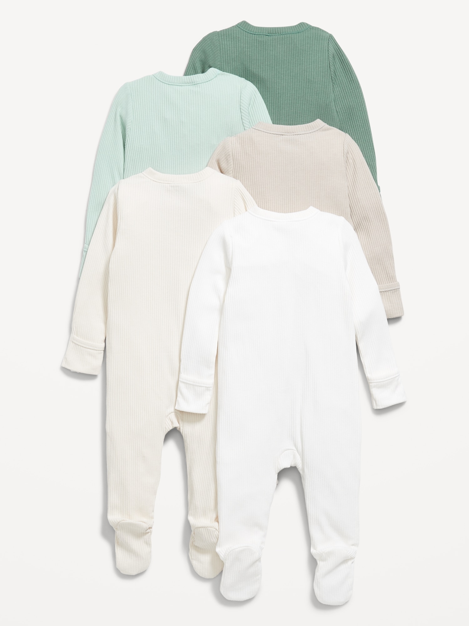 2-Way-Zip Sleep & Play Footed One-Piece 5-Pack for Baby: rib-knit crew neck, long sleeves, fold-over mittens at each sleeve, reversible two-way zipper, sewn-in feet, #694133