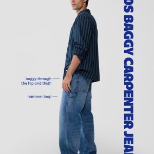 90’s Baggy Jeans: Roomy from hip to ankle, with puddling at the foot.zip fly, front scoop pockets, back patch pockets, #788030