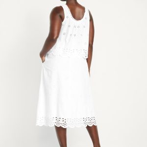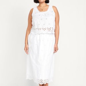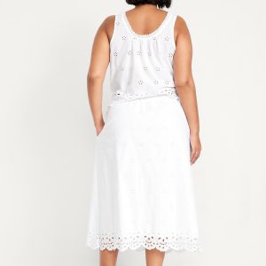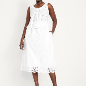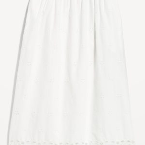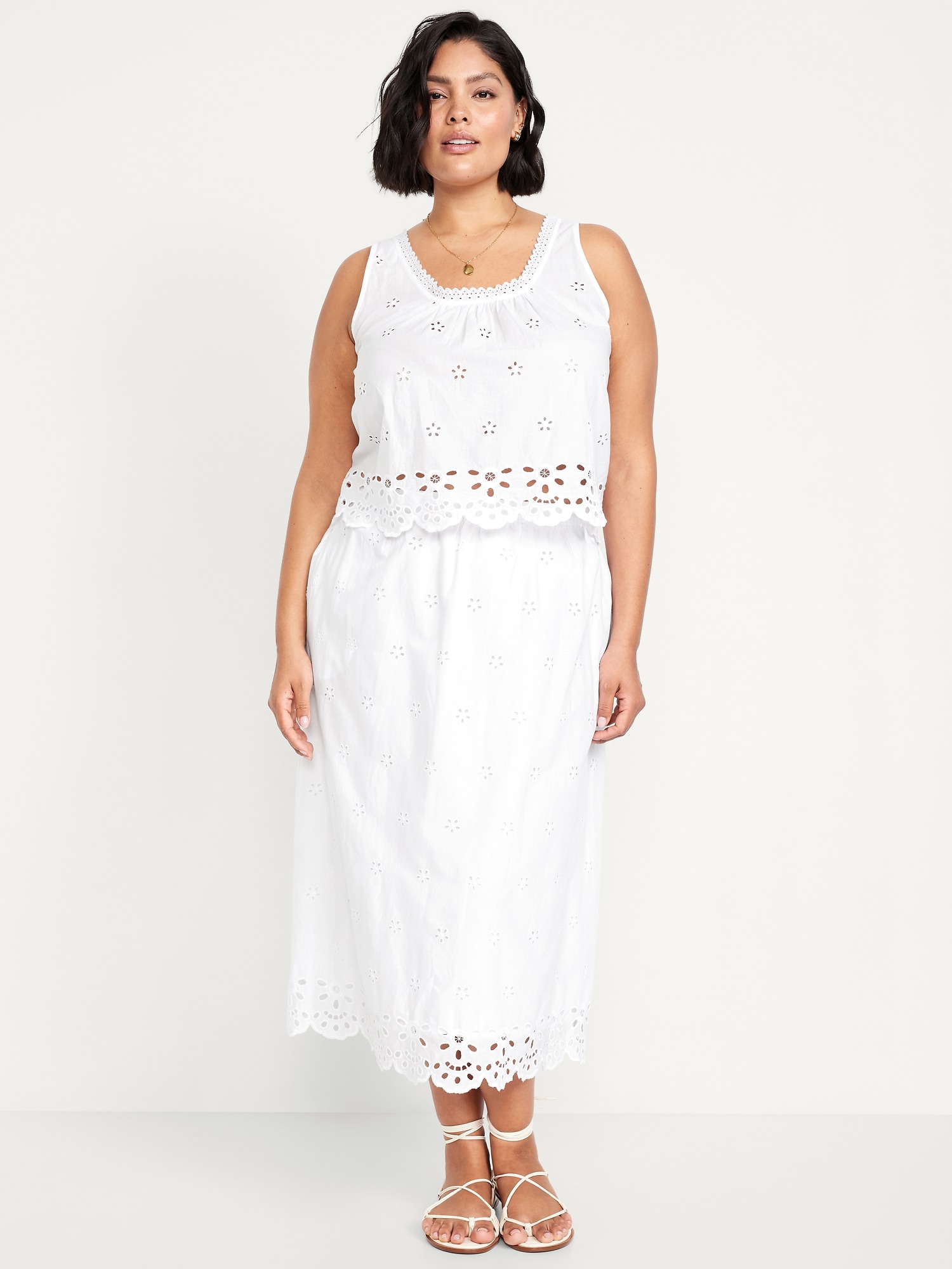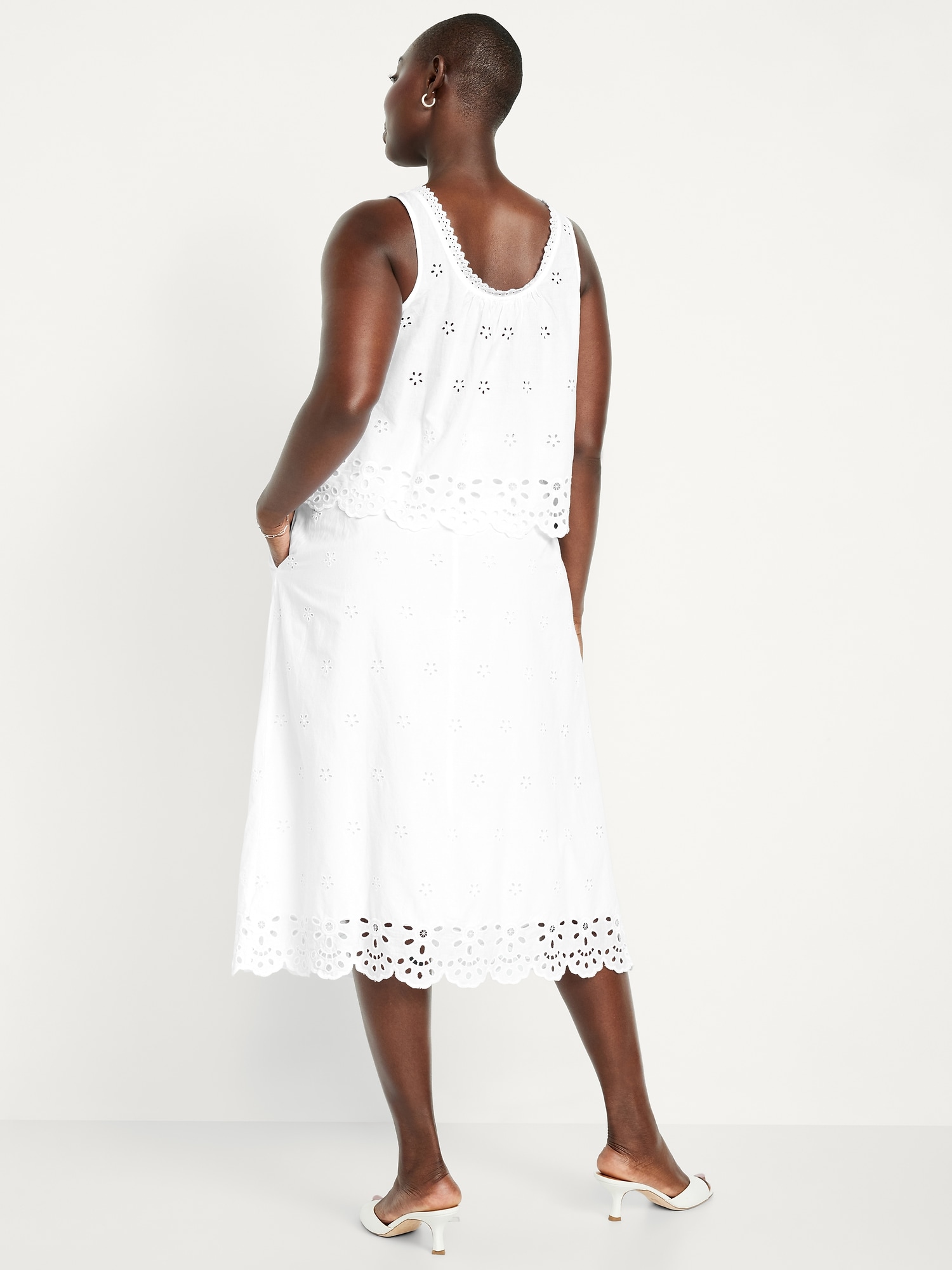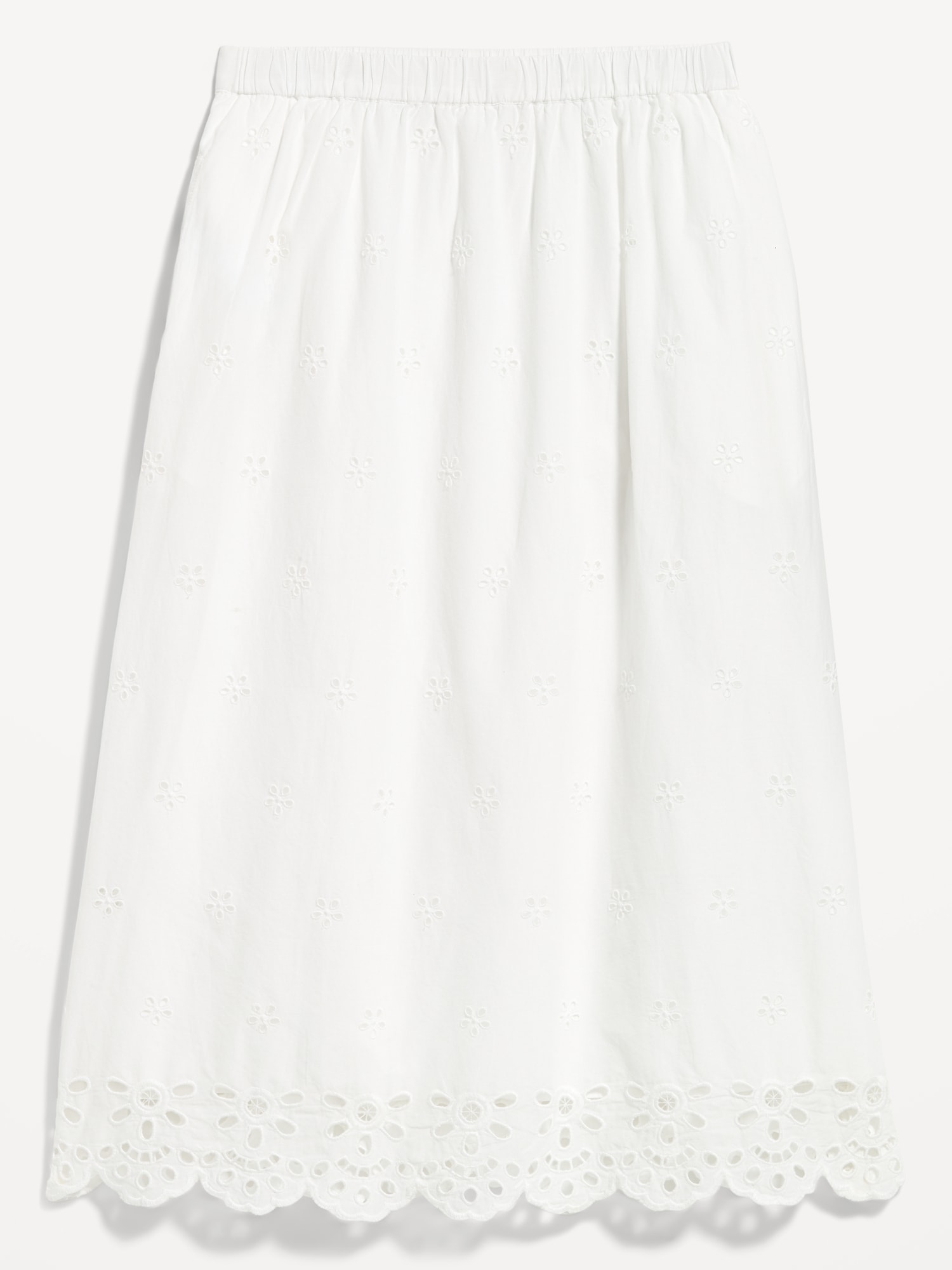 A-Line Eyelet Midi Skirt: elastic pull-on waistband, all-over embroidered detail, eyelet-scallop hem, #705284