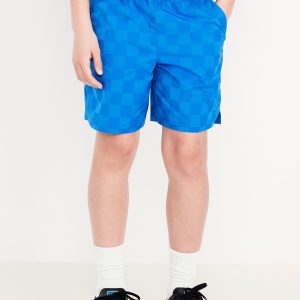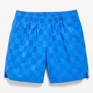 Above Knee Performance Shorts for Boys: elasticized waistband, functional drawstring, diagonal on-seam pockets, all-over checkered pattern, #762122