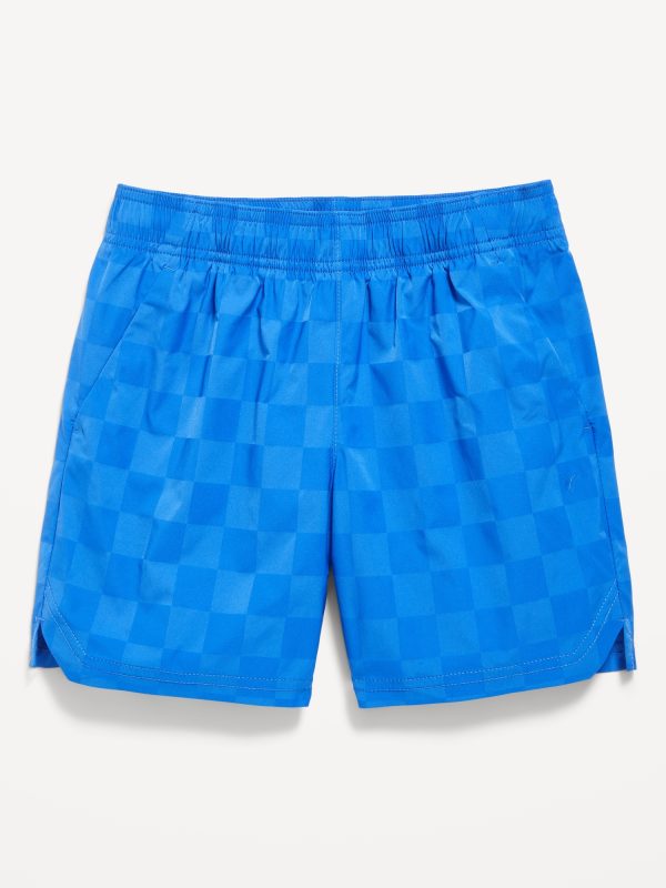 Above Knee Performance Shorts for Boys: elasticized waistband, functional drawstring, diagonal on-seam pockets, all-over checkered pattern, #762122