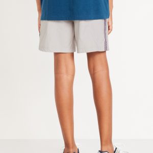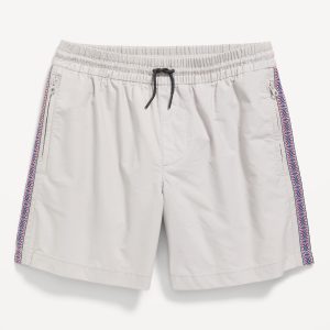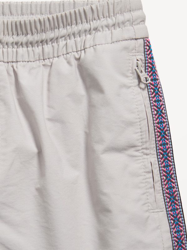 Above Knee Tech Zip-Pocket Shorts for Boys: elasticized waistband, functional drawstring, zippered pockets, contrasting patterned tape trim at sides, #686068