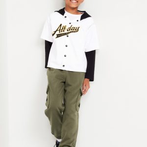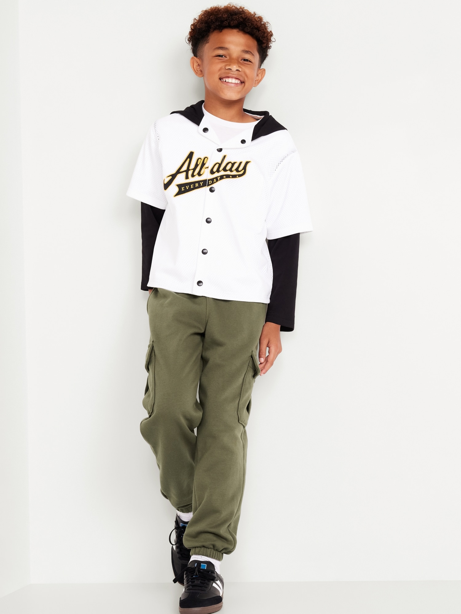 Baggy Cargo Jogger Sweatpants for Boys: elasticized waist, functional drawstring, on-seam welt pockets, snap-button cargo pockets, cinched leg cuffs, #564944