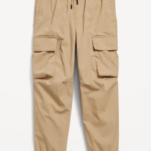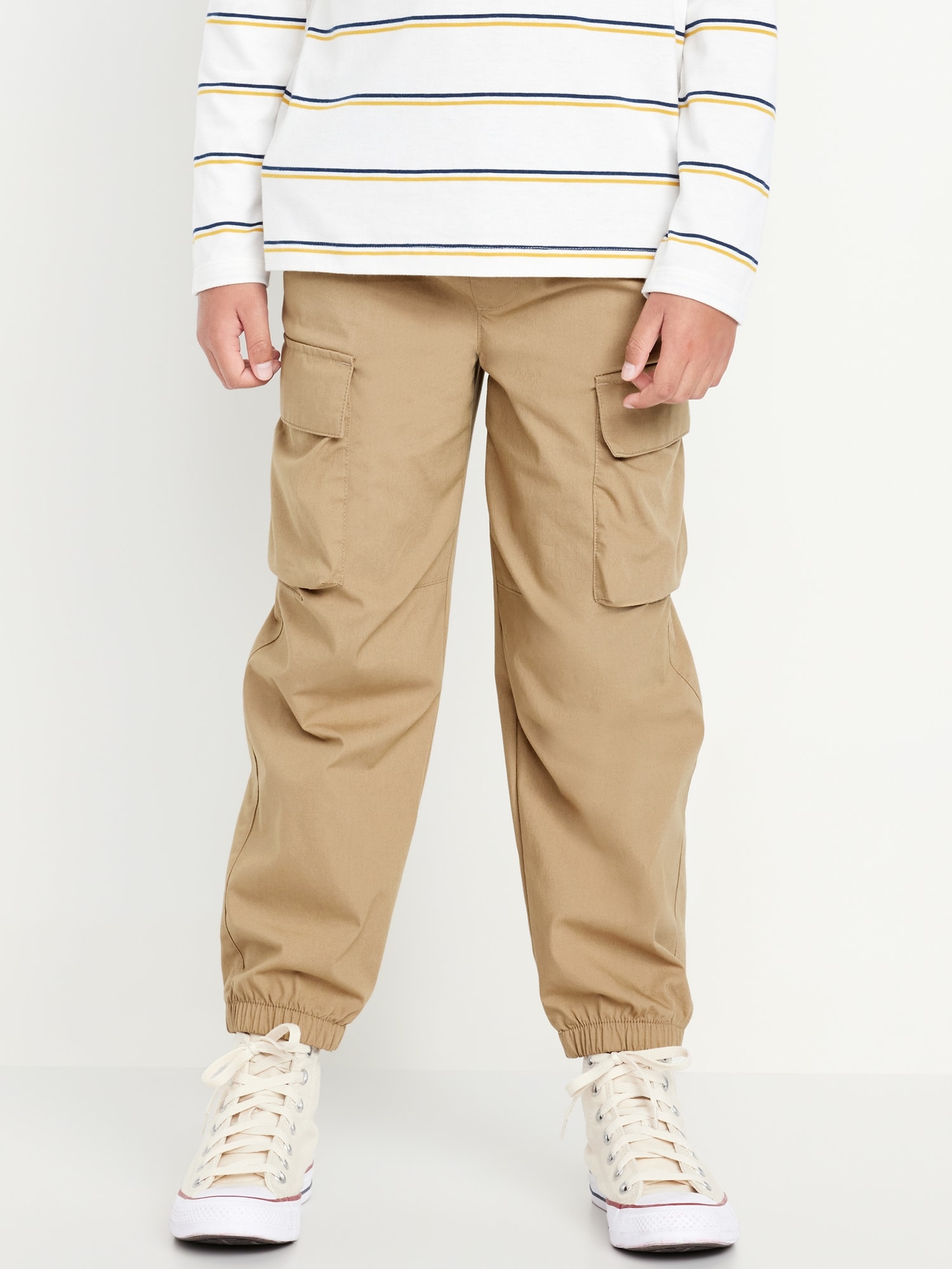 Baggy Cargo Pants for Boys: elasticized waist, functional drawstring, on-seam pockets, single welt pocket at back, adhesive secure-close cargo pocket at each leg, cinched leg cuffs, #565426