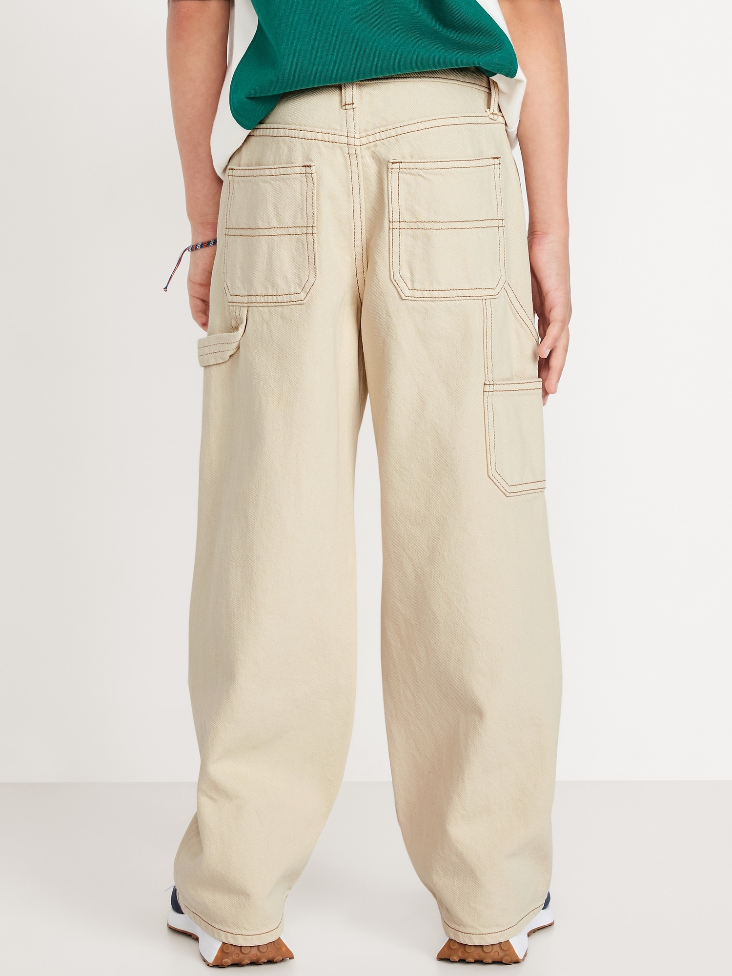 Baggy Carpenter Jeans for Boys: interior adjustable waistband, snap-button closure in sizes 5-8, regular button closure in sizes 10-20, zip fly, diagonal pockets, panel at each leg, utility patch pockets at back, built-in hammer loop at left leg, #766418