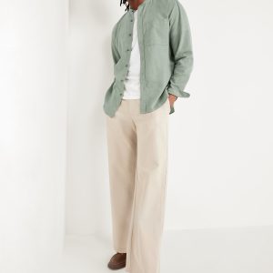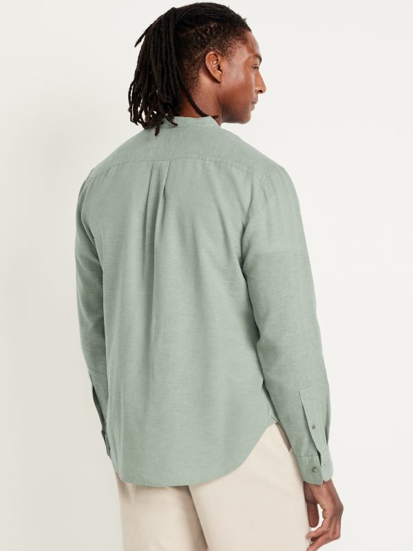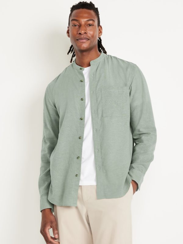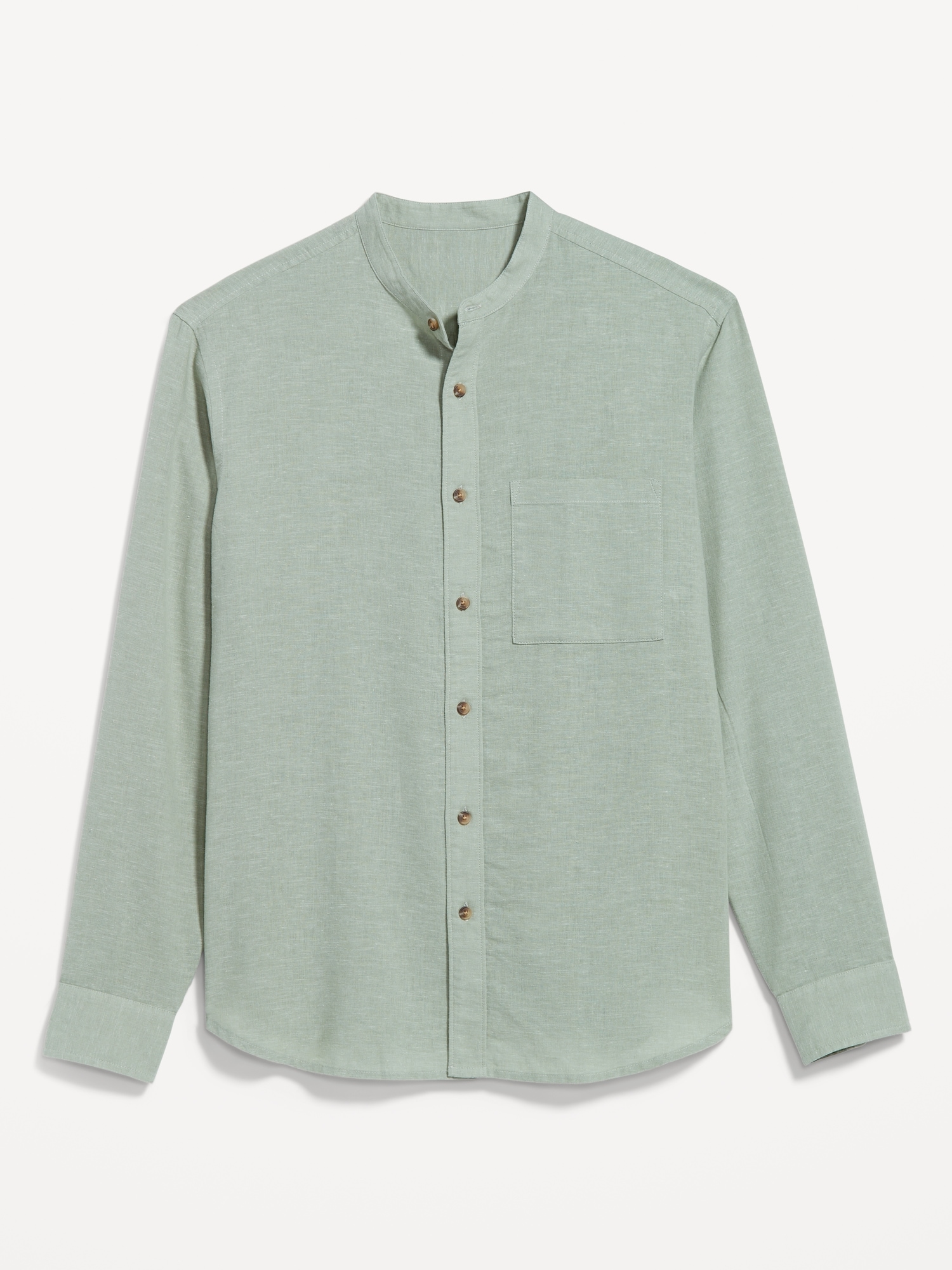 Banded-Collar Linen-Blend Shirt: banded collar, long sleeves, buttoned cuffs, full-button front, patch chest pocket, #691164
