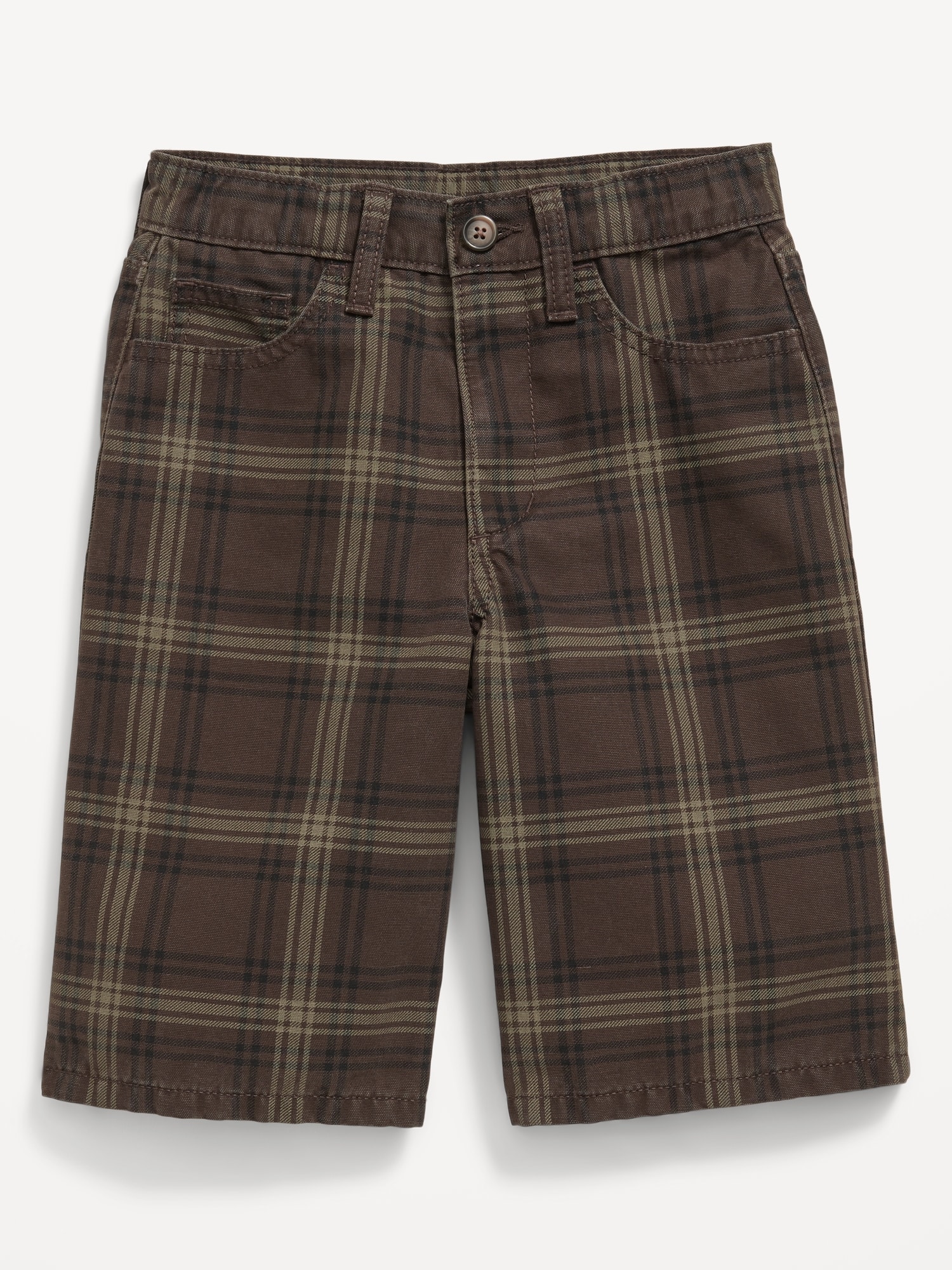 Below Knee Baggy Canvas Shorts for Boys: interior adjustable waistband, regular button closure, zip fly, scoop pockets and coin pocket in front, patch pockets in back, below knee, #766370