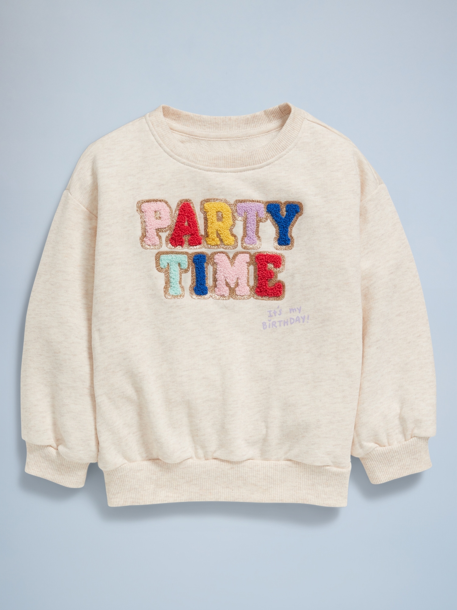 Birthday French-Terry Graphic Sweatshirt for Toddler Girls: The (Bestest) Birthday Shop!crew neck, long sleeves, drop shoulders, graphic at front, it’s her bday, she can party if she wants to, #690114