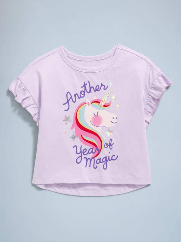 Birthday Graphic T-Shirt for Toddler Girls: The (Bestest) Birthday Shop!crew neck, short ruffle sleeves, graphic at front, rounded hem, #689939