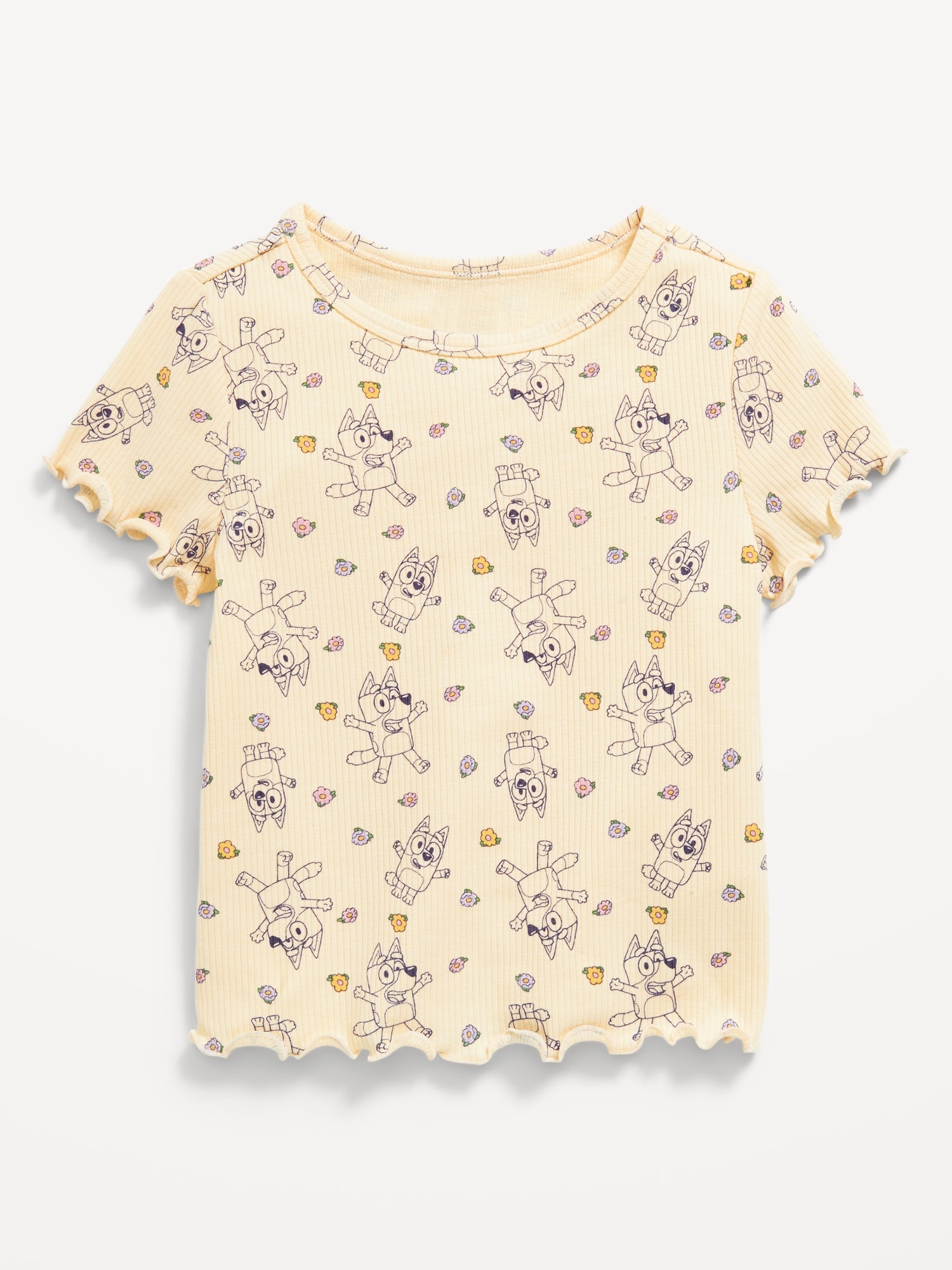Bluey™ Ribbed Graphic T-Shirt for Toddler Girls: crew neck, short sleeves, licensed graphic, lettuce-edge cuffs and hem, BLUEY™ and character logo™ and © Ludo Studio. Licensed by BBC Studios Distribution Ltd., #725133