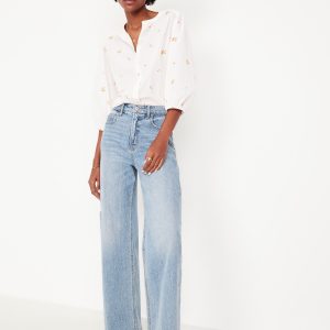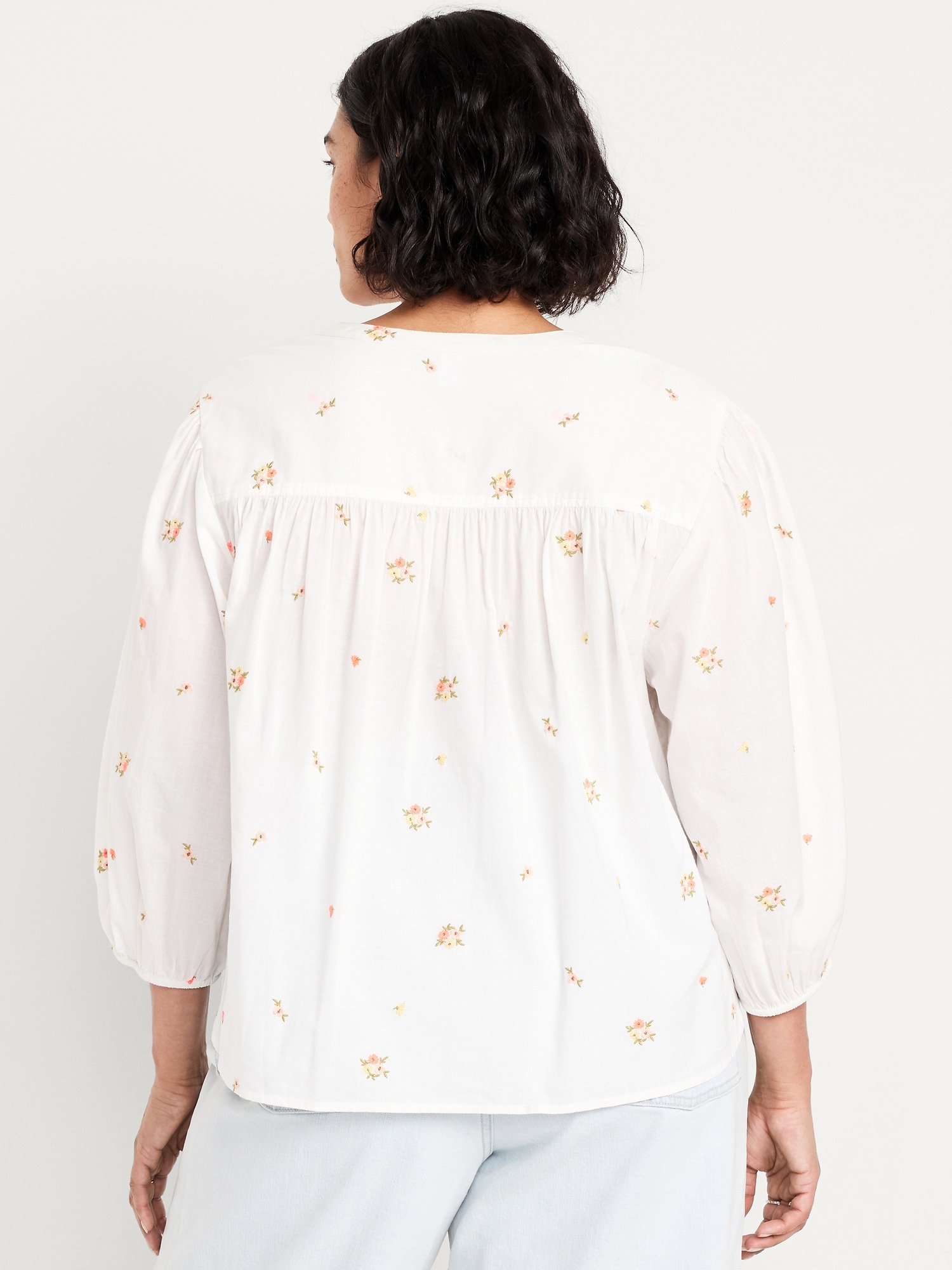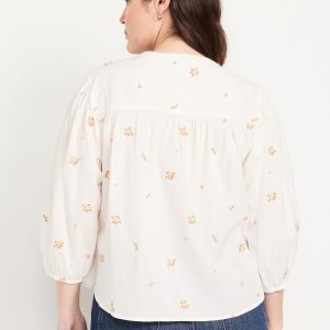 Button-Down Floral Shirt: banded collar, bracelet sleeves, elastic cuffs, full-button front, shirred detail, ditsy floral print, #704713