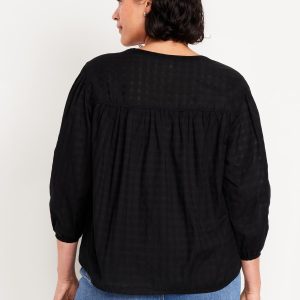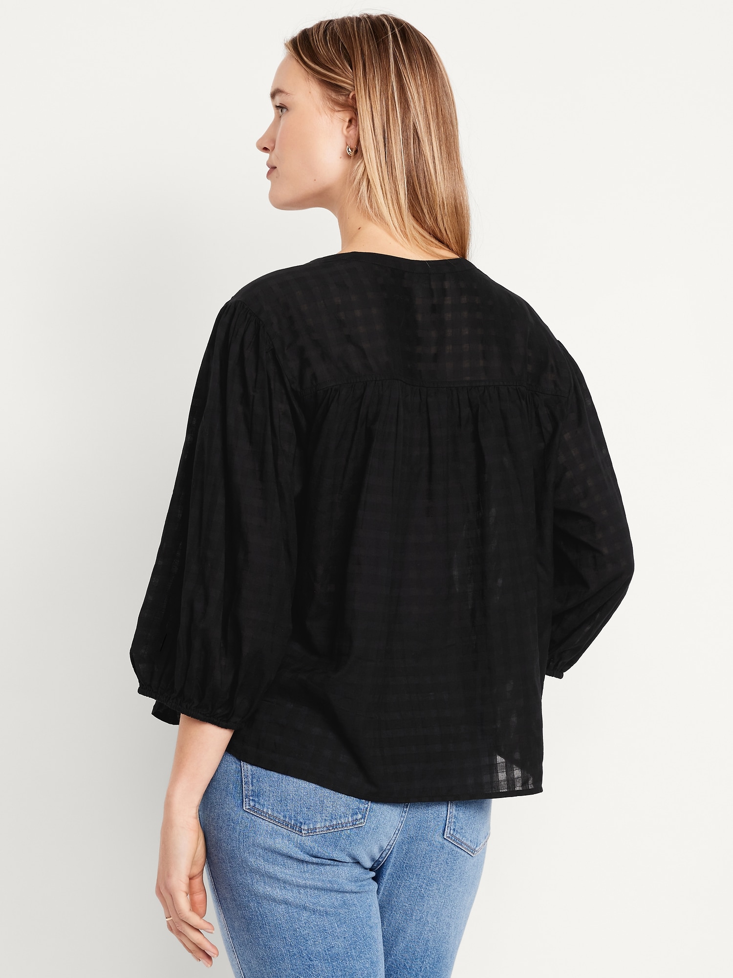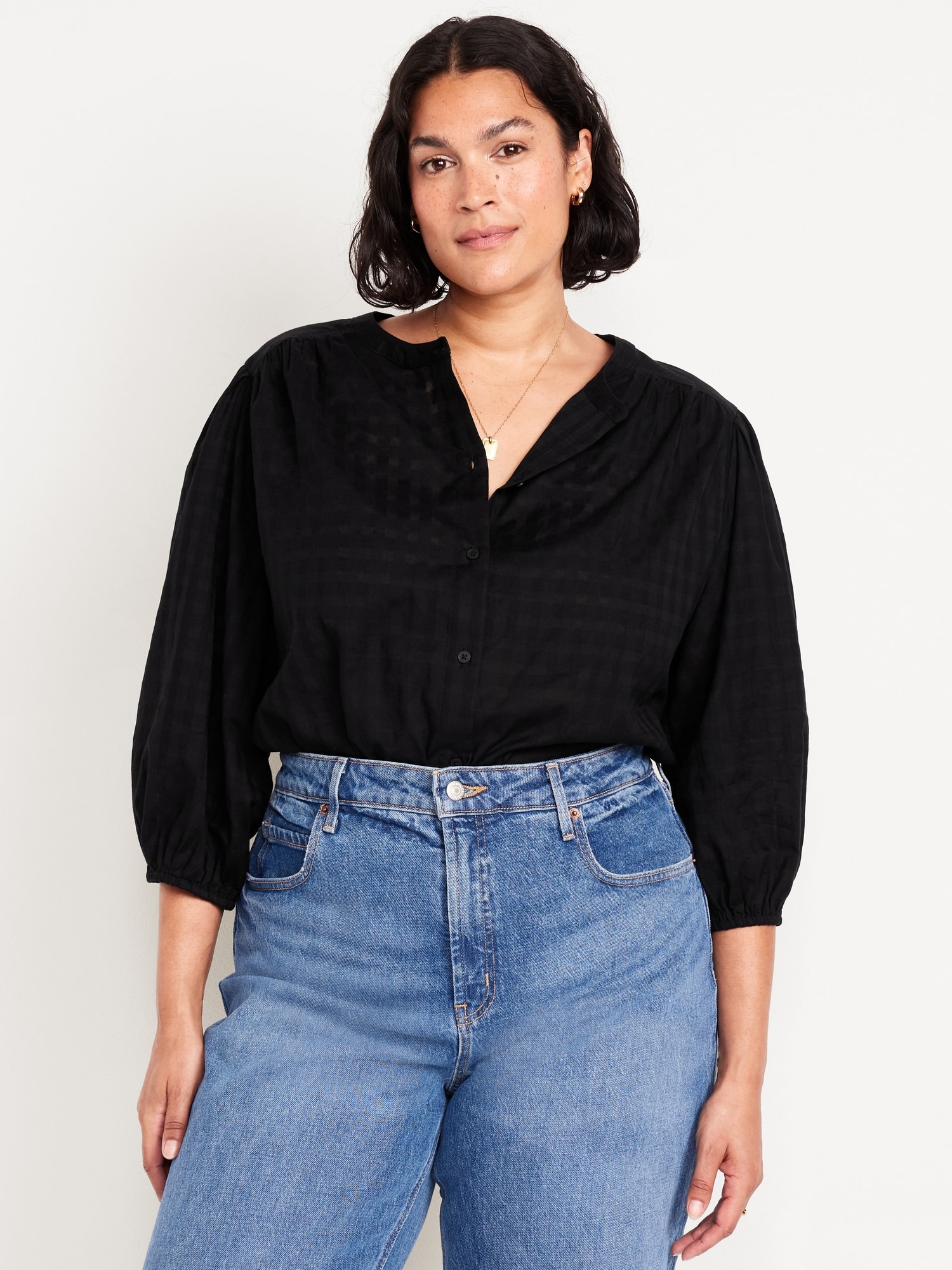 Button-Down Lightweight Dobby Shirt: banded collar, bracelet sleeves, elastic cuffs, full-button front, shirred detail, ditsy floral print, #704713