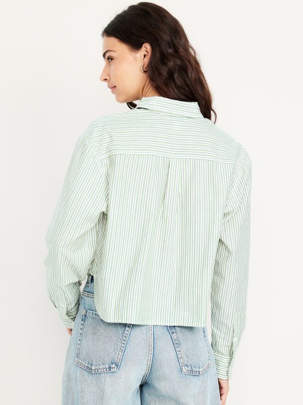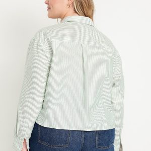 Button-Down Oxford Crop Shirt: spread collar, long sleeves with buttoned cuffs, full-button front, patch chest pocket, vertical striped print, #825106