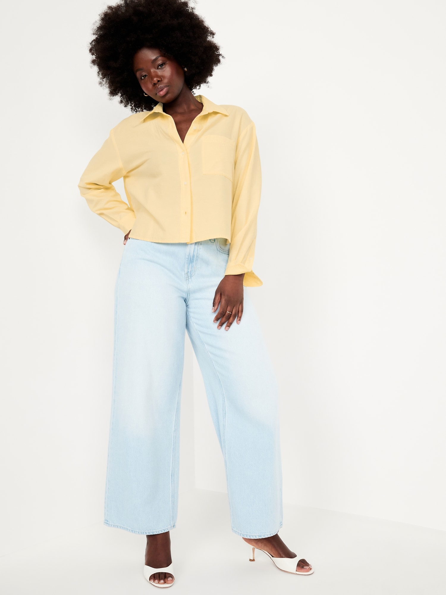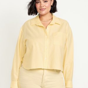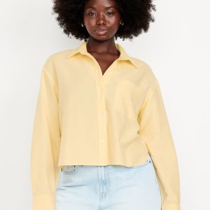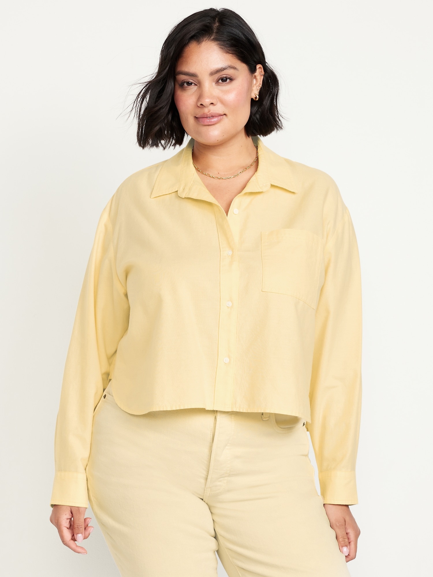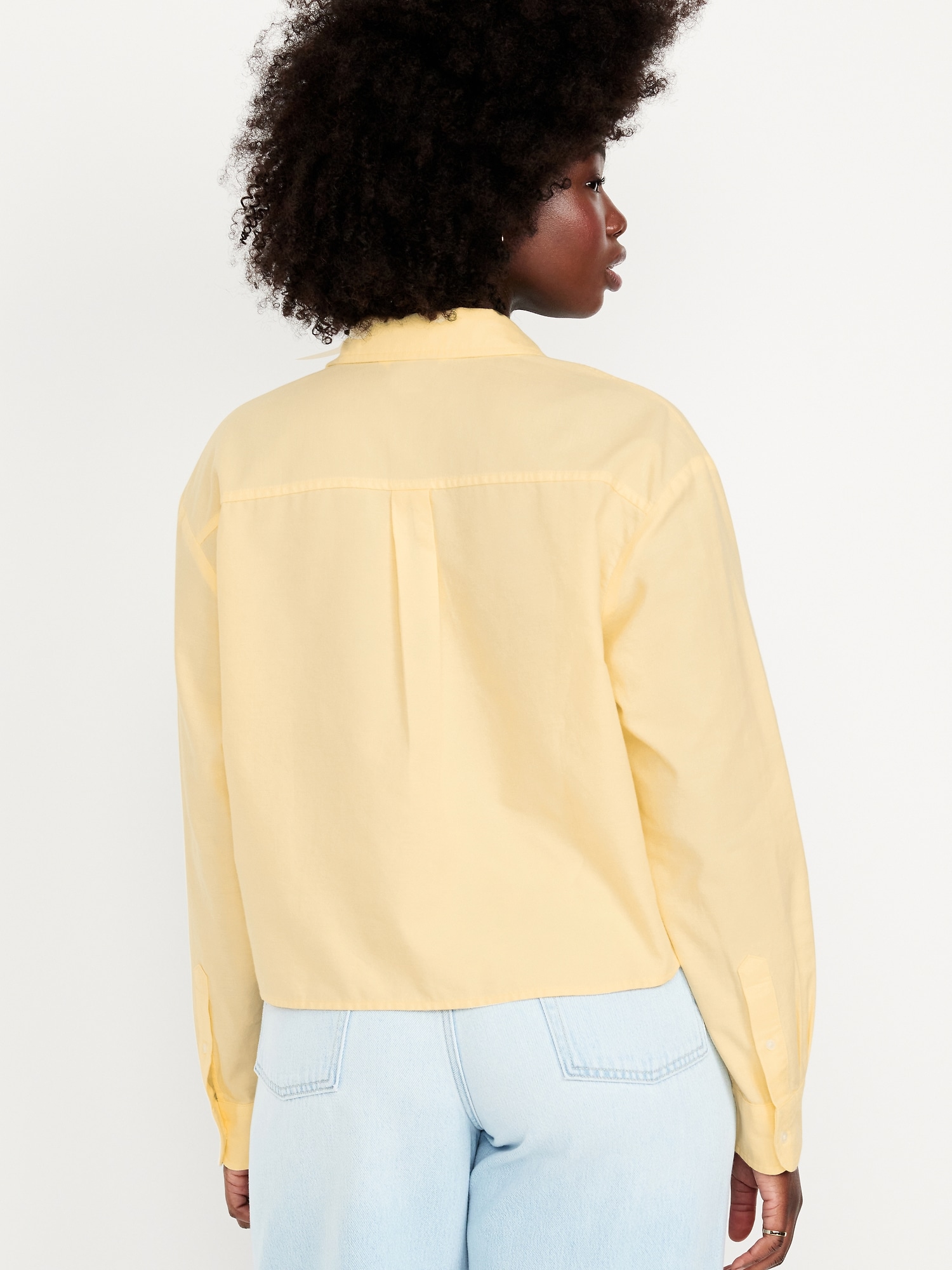 Button-Down Oxford Crop Shirt: spread collar, long sleeves with buttoned cuffs, full-button front, patch chest pocket, vertical striped print, #825106