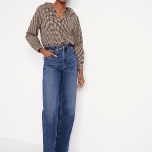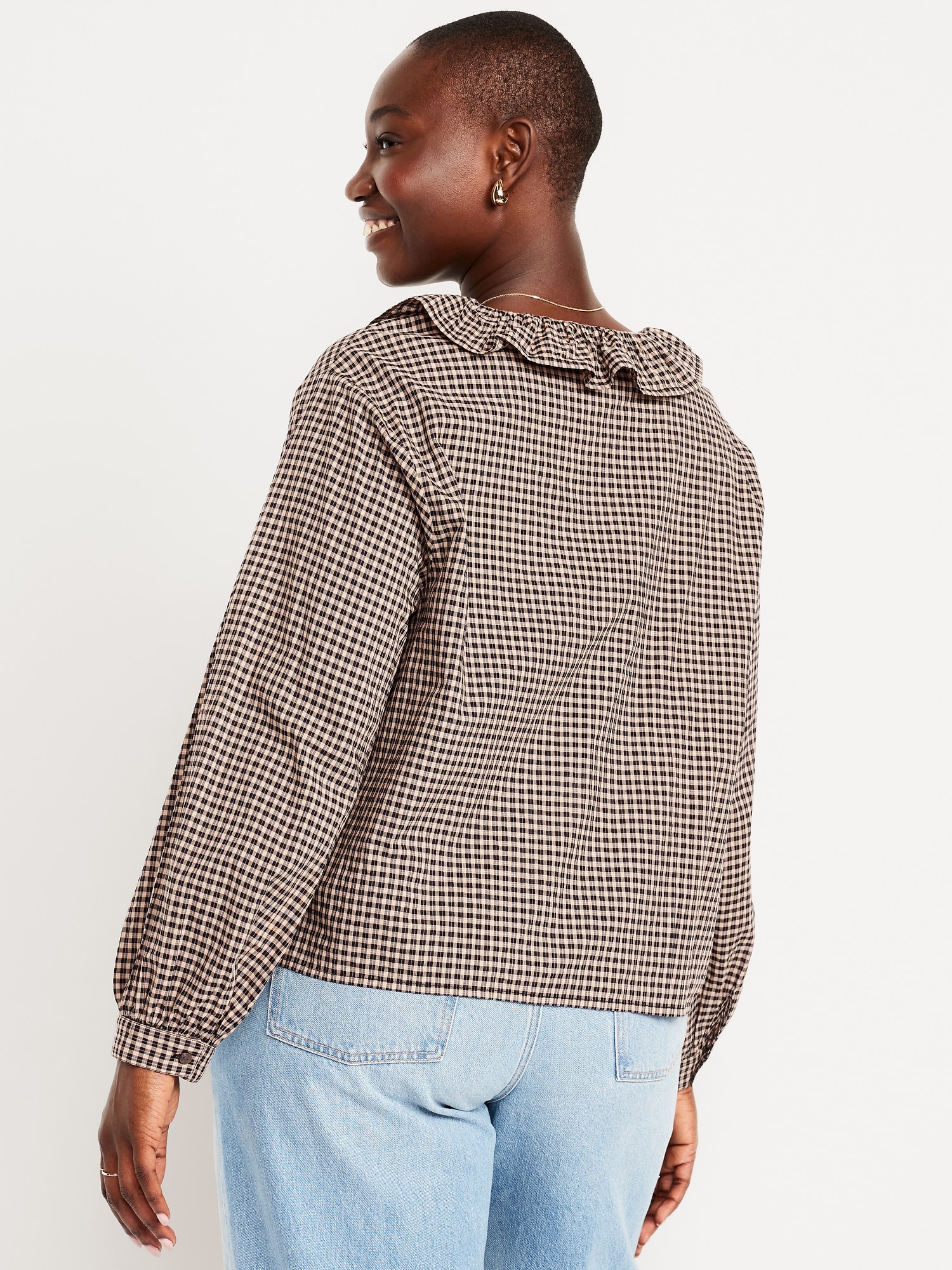 Button-Down Ruffle Shirt: ruffle collar, long sleeves, shirred-button cuffs, full-button front, plaid print, #805732