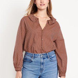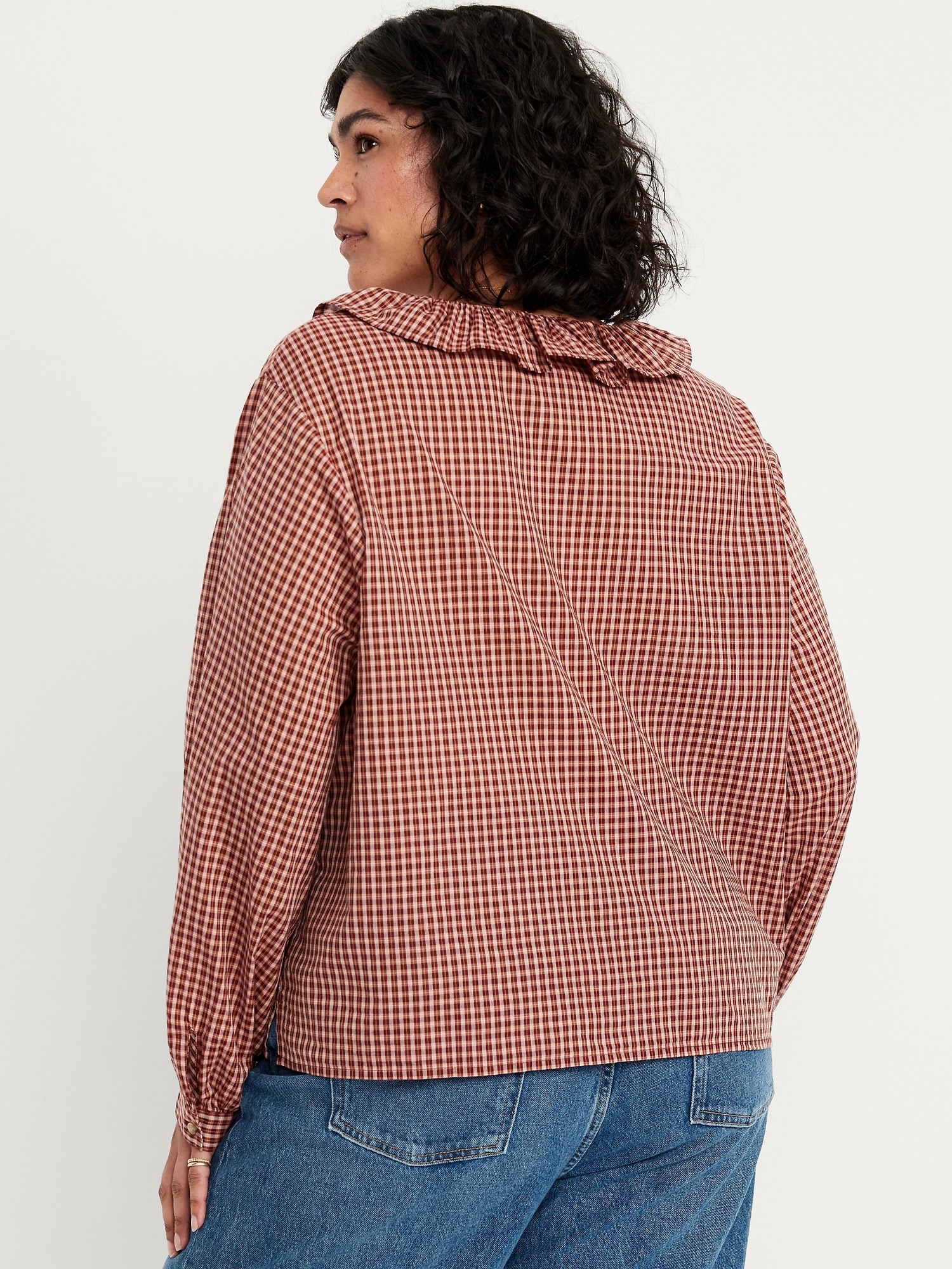 Button-Down Ruffle Shirt: ruffle collar, long sleeves, shirred-button cuffs, full-button front, plaid print, #805732