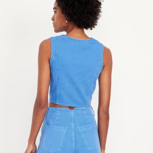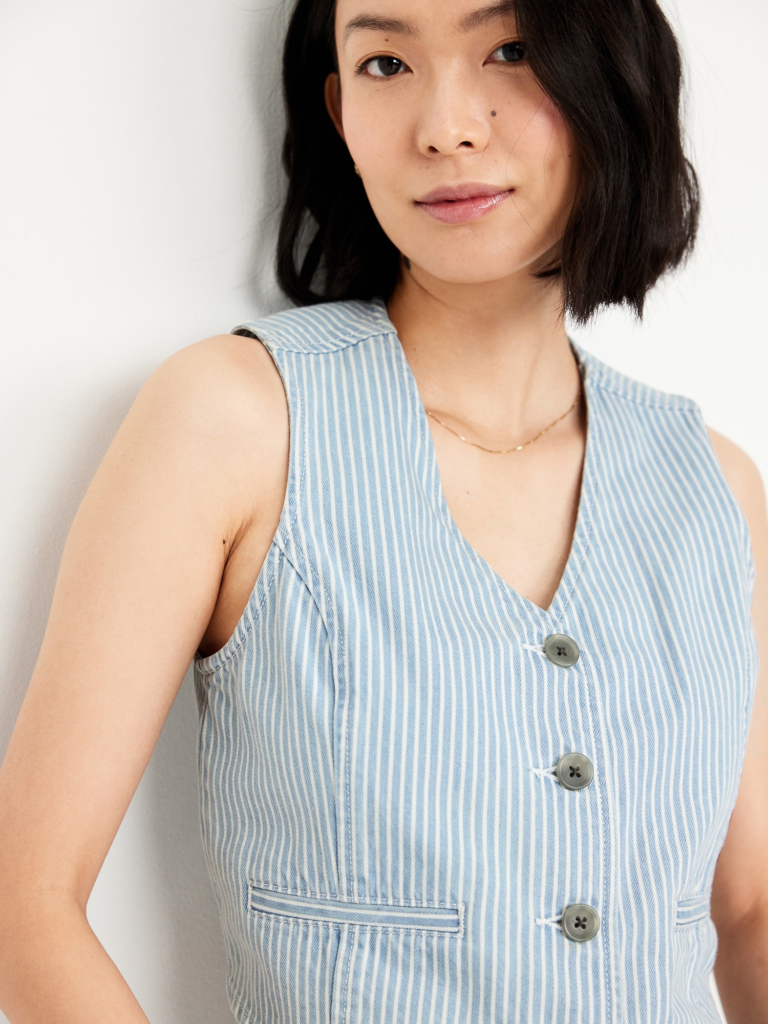 Button-Front Jean Vest: v-neck, four-button front, decorative welt pockets, princess seams, #693819