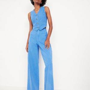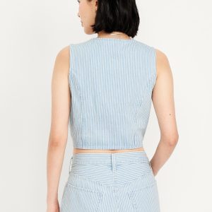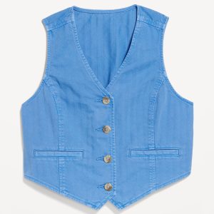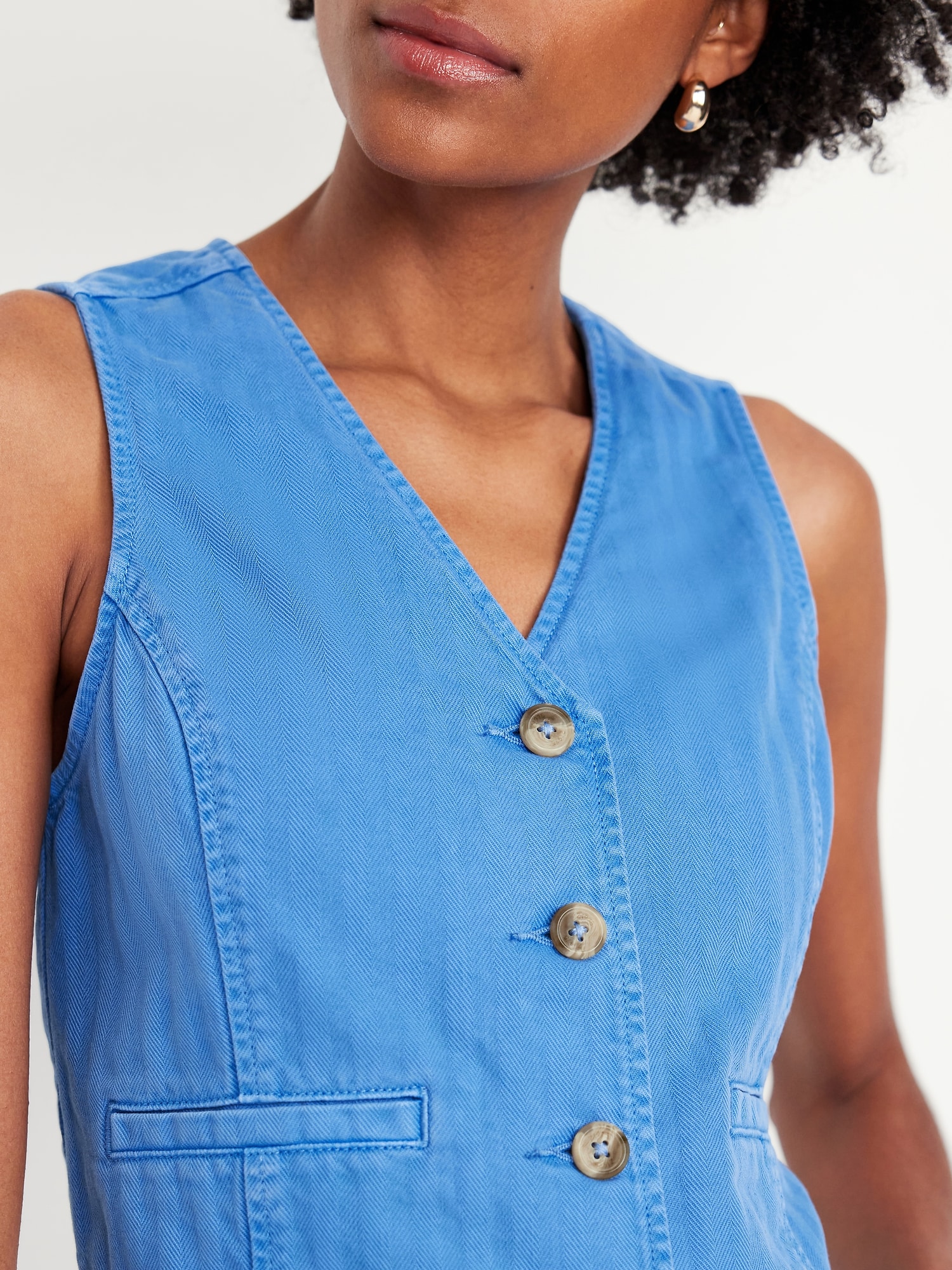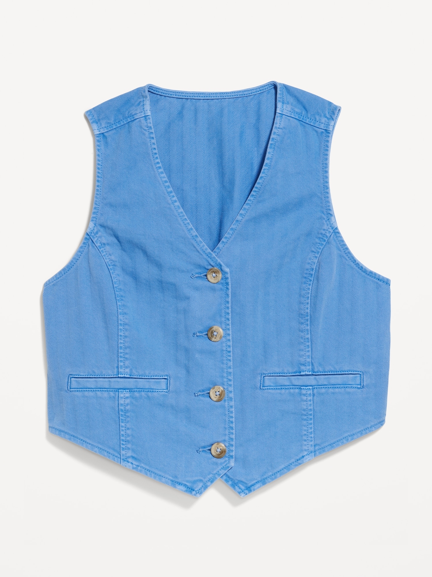 Button-Front Jean Vest: v-neck, four-button front, decorative welt pockets, princess seams, #693819