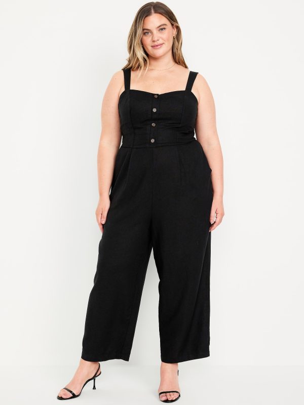 Button-Front Linen-Blend Cami Jumpsuit: sweetheart neckline, wide adjustable straps, four-button front, hip pockets, smocked back, #681202