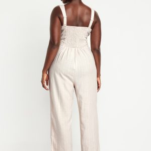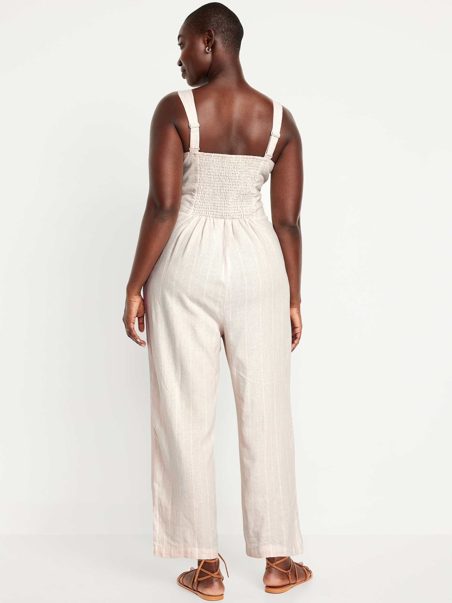 Button-Front Linen-Blend Cami Jumpsuit: sweetheart neckline, wide adjustable straps, four-button front, hip pockets, smocked back, #681202