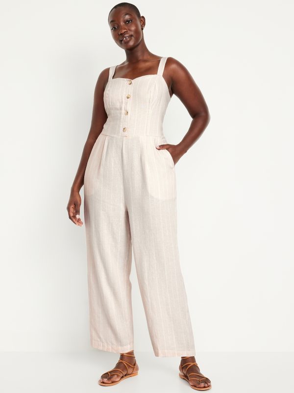 Button-Front Linen-Blend Cami Jumpsuit: sweetheart neckline, wide adjustable straps, four-button front, hip pockets, smocked back, #681202