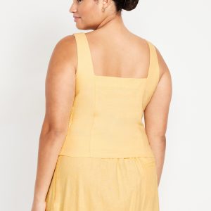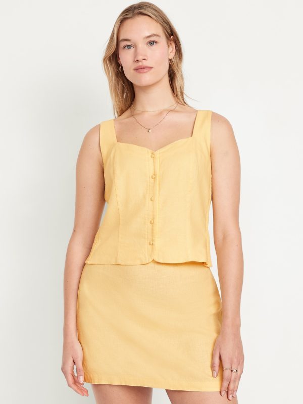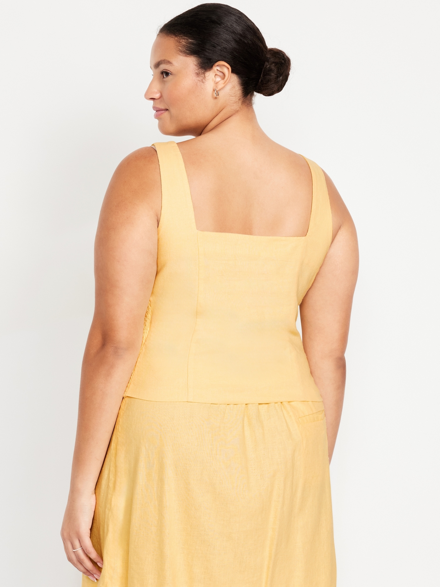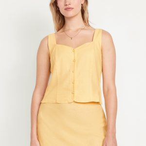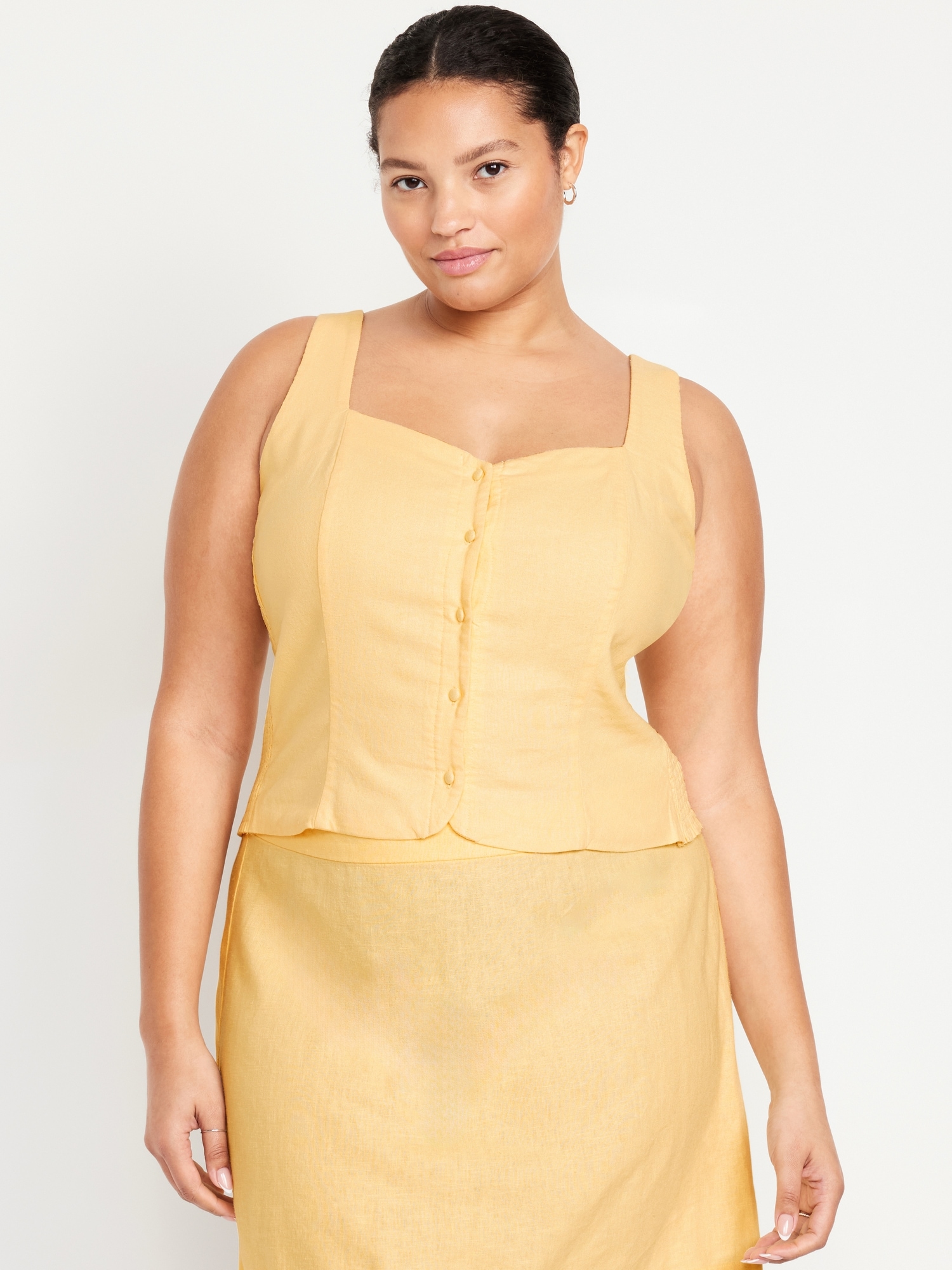 Button-Front Linen-Blend Vest: sweetheart neckline, wide straps, five-button front, smocked side panels, princess seams, striped print, #704099