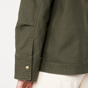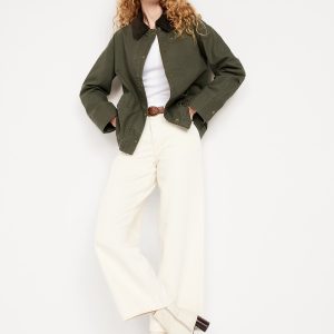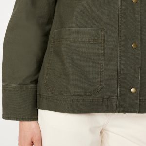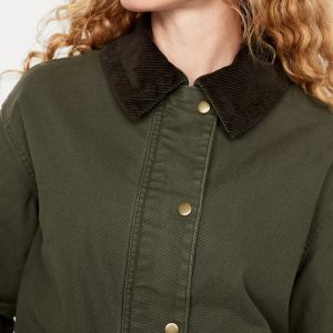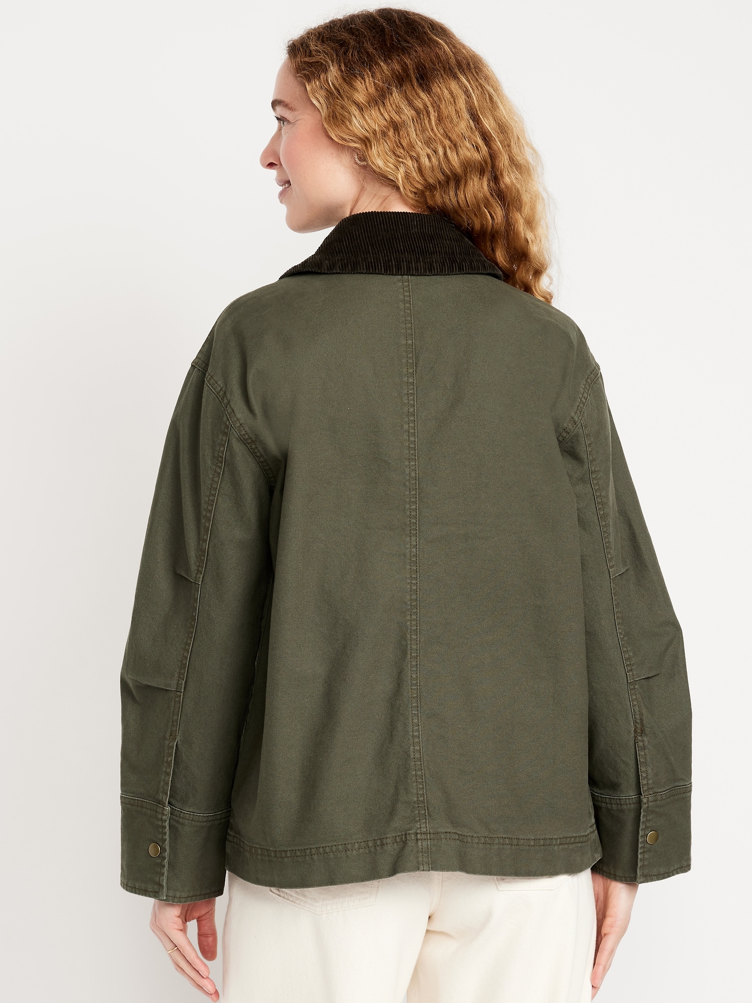 Canvas Barn Jacket: corduroy collar, long sleeves with snap cuffs, full-snap front with hidden zipper, patch pockets, #766357
