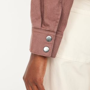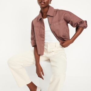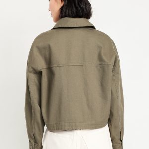 Canvas Crop Utility Jacket: spread collar, long sleeves, snap cuffs, snap front, patch chest pockets, seamed yoke, #663795