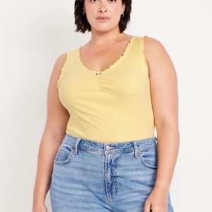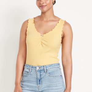 Cinched Rib-Knit Tank Top: deep v-neck, wide ruffled straps, cinched front with rosette applique, #791559