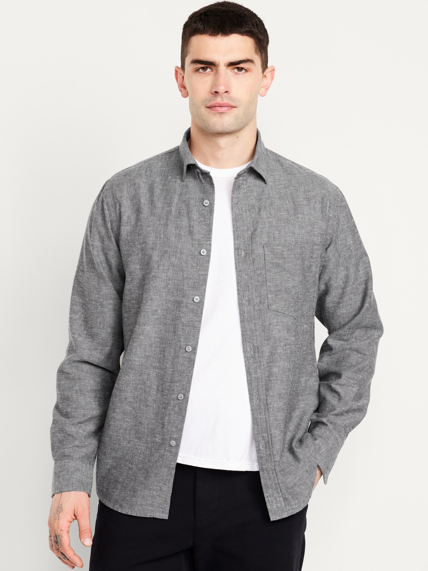 Classic Fit Linen-Blend Shirt: spread collar, long sleeves, buttoned cuffs, full-button front, patch chest pocket, #691163