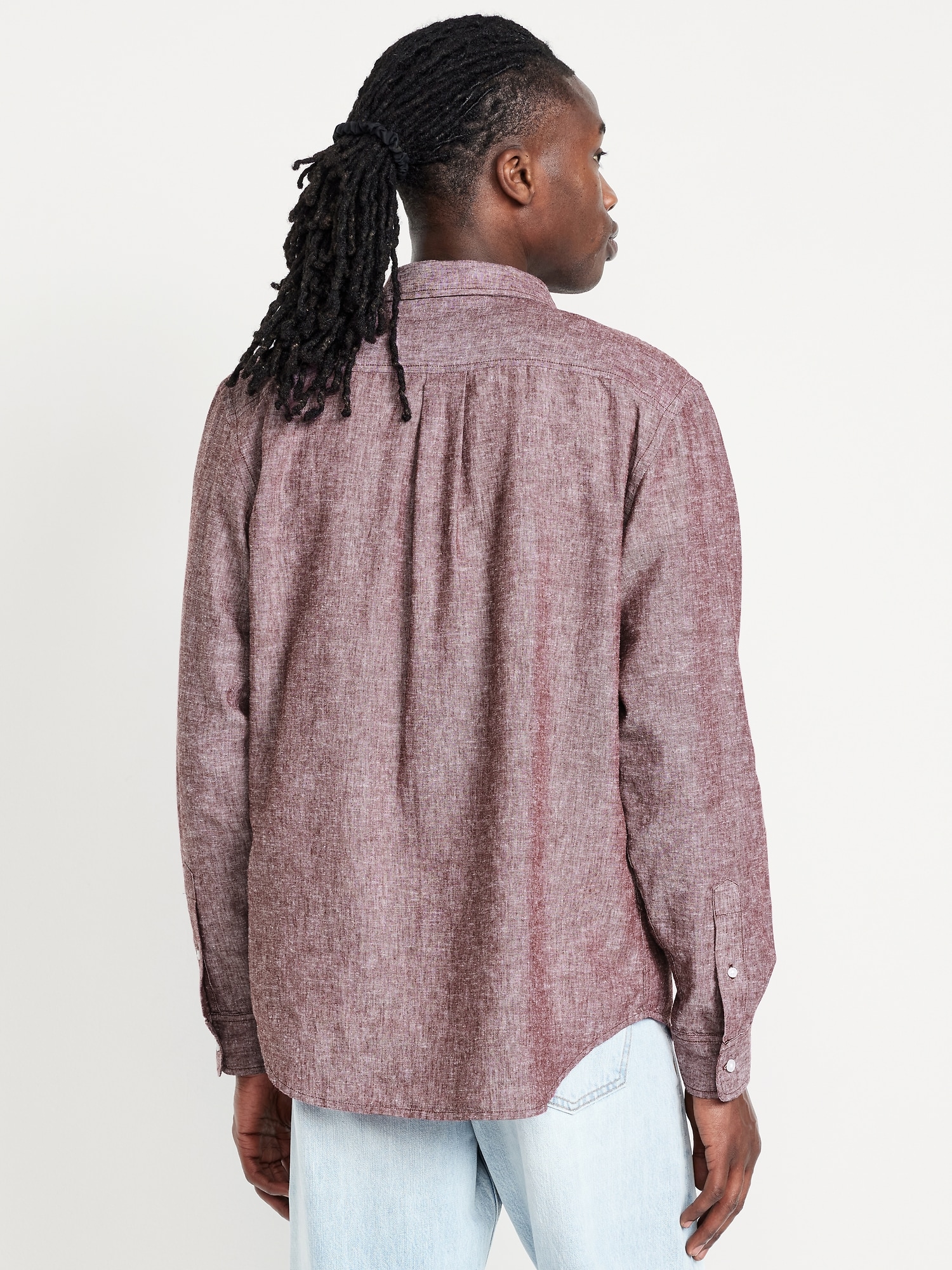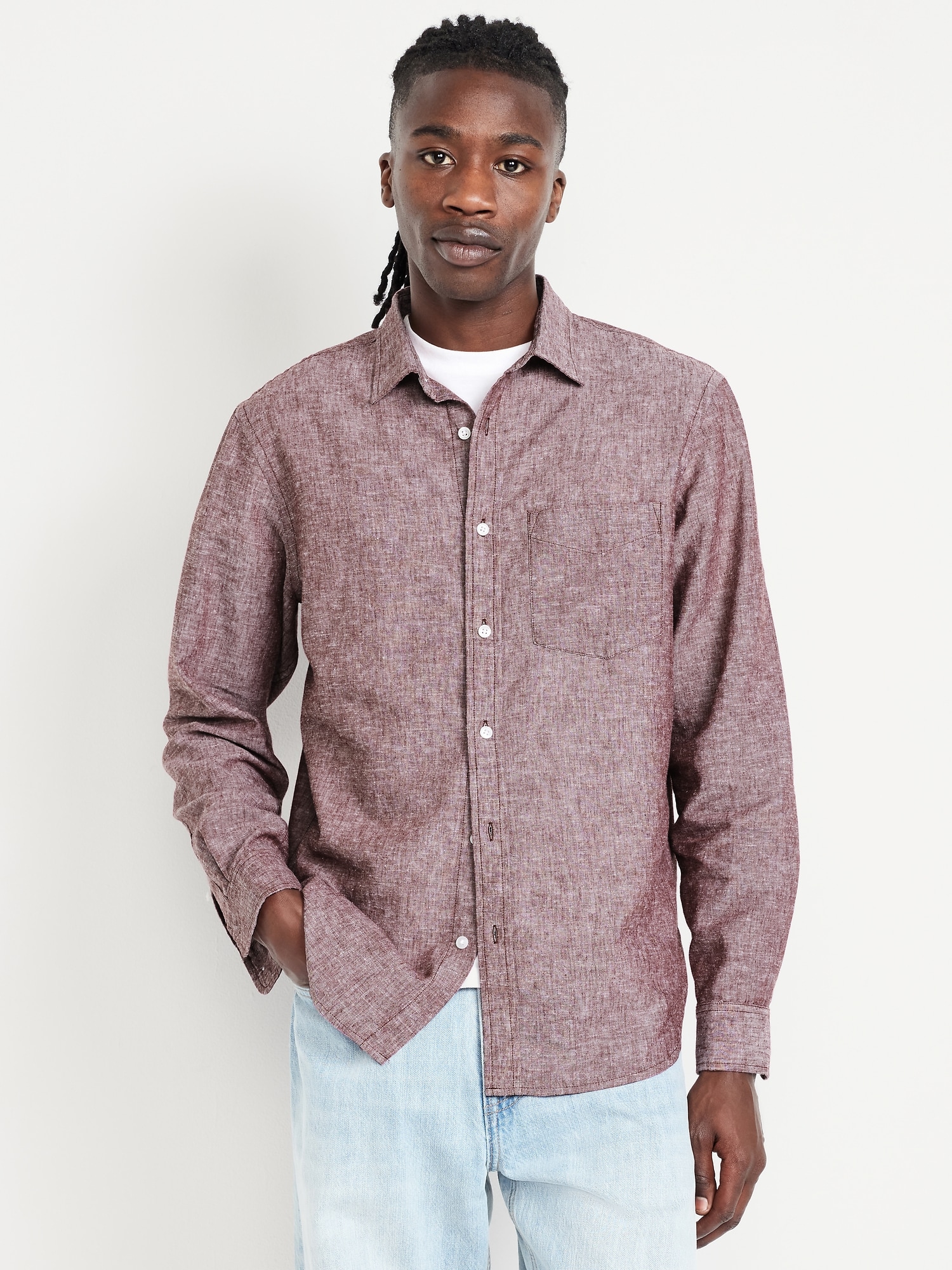 Classic Fit Linen-Blend Shirt: spread collar, long sleeves, buttoned cuffs, full-button front, patch chest pocket, #691163