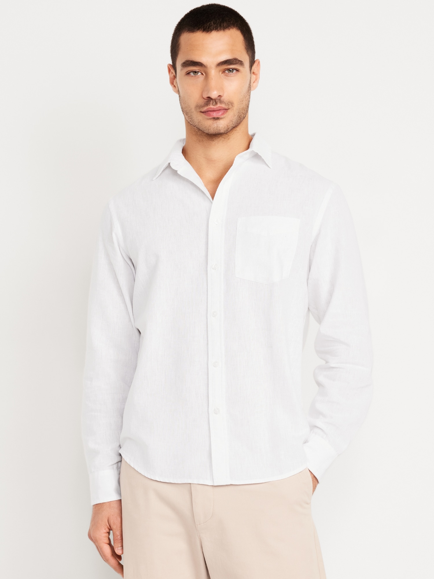Classic Fit Linen-Blend Shirt: spread collar, long sleeves, buttoned cuffs, full-button front, patch chest pocket, #691163