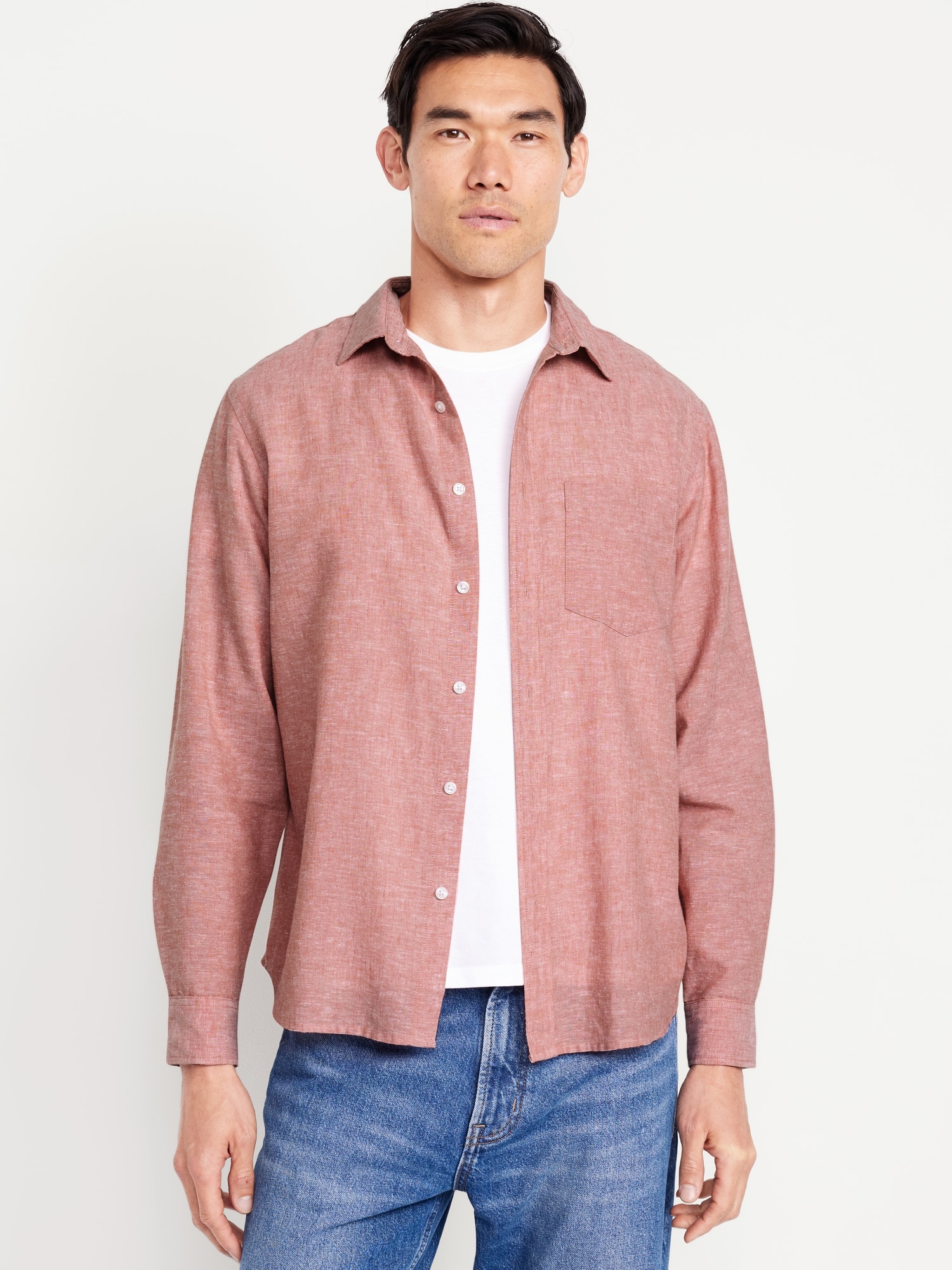 Classic Fit Linen-Blend Shirt: spread collar, long sleeves, buttoned cuffs, full-button front, patch chest pocket, #691163