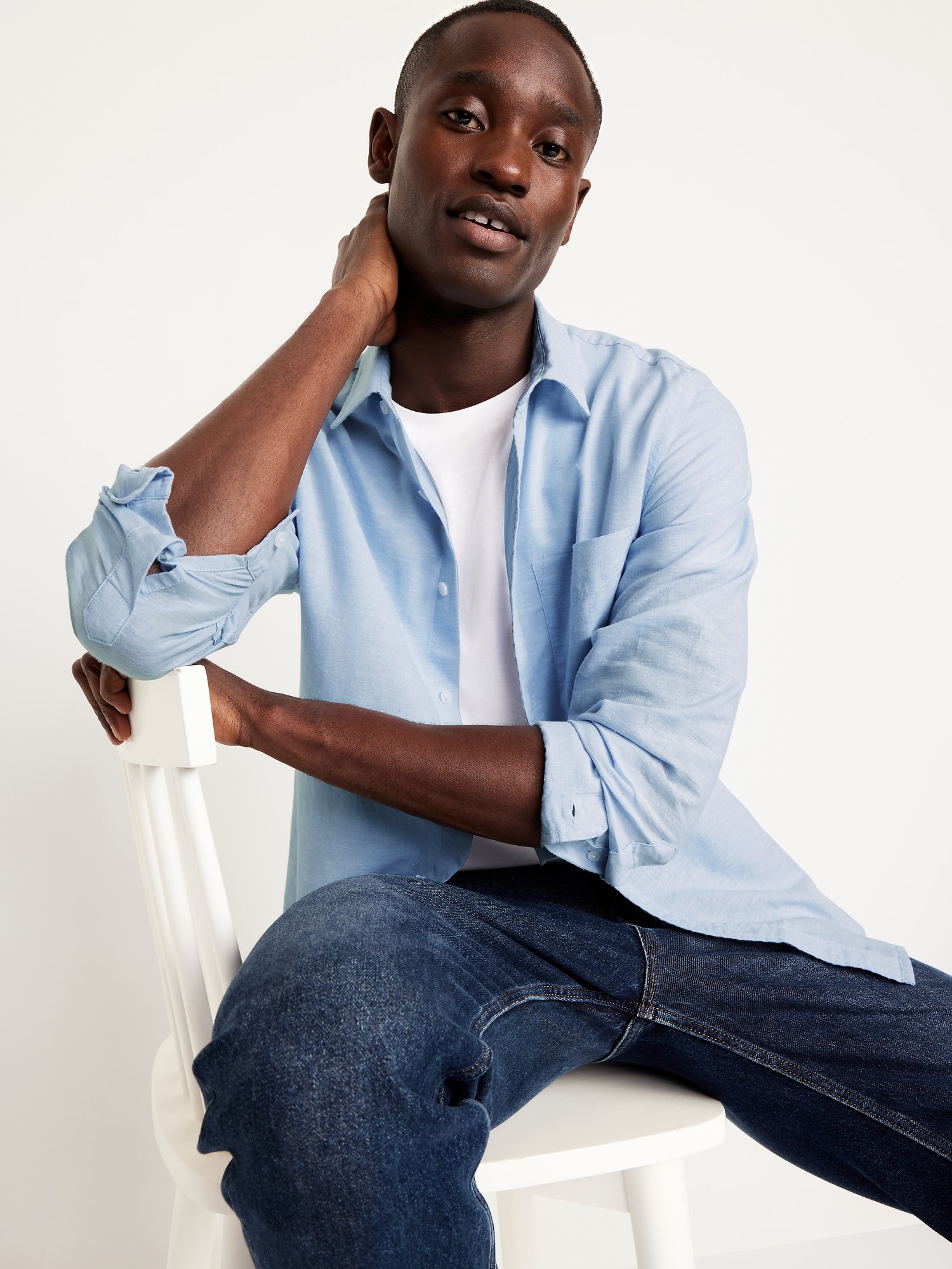 Classic Fit Linen-Blend Shirt: spread collar, long sleeves, buttoned cuffs, full-button front, patch chest pocket, #691163