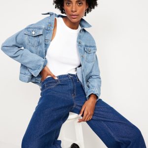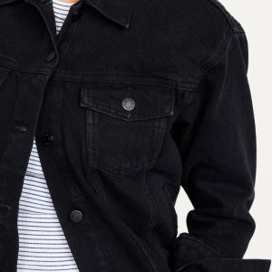 Classic Jean Jacket: spread collar, long sleeves, buttoned cuffs, flap-button chest pockets, on-seam front pockets, full-button front, banded hem, adjustable button tabs at back waist, #467752