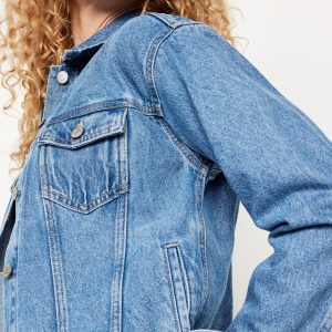 Classic Jean Jacket: spread collar, long sleeves, buttoned cuffs, flap-button chest pockets, on-seam front pockets, full-button front, banded hem, adjustable button tabs at back waist, #467752