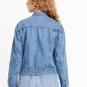 Classic Jean Jacket: spread collar, long sleeves, buttoned cuffs, button front, button-flap chest pockets, vertical welt pockets, adjustable button tabs at back waist, #465150