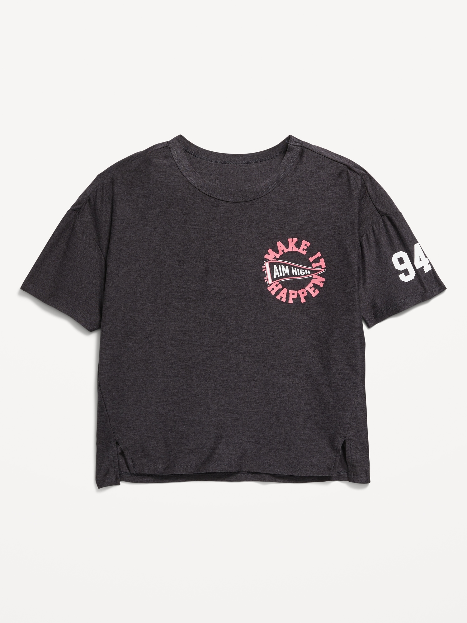CloudMotion Cropped Graphic Performance T-Shirt for Girls: The new Cloud94 Soft. Versatile, sweat-wicking and soft as a literal cloud.crew neck, short sleeves, drop shoulders, graphic at front, side slits, slightly cropped, #511746