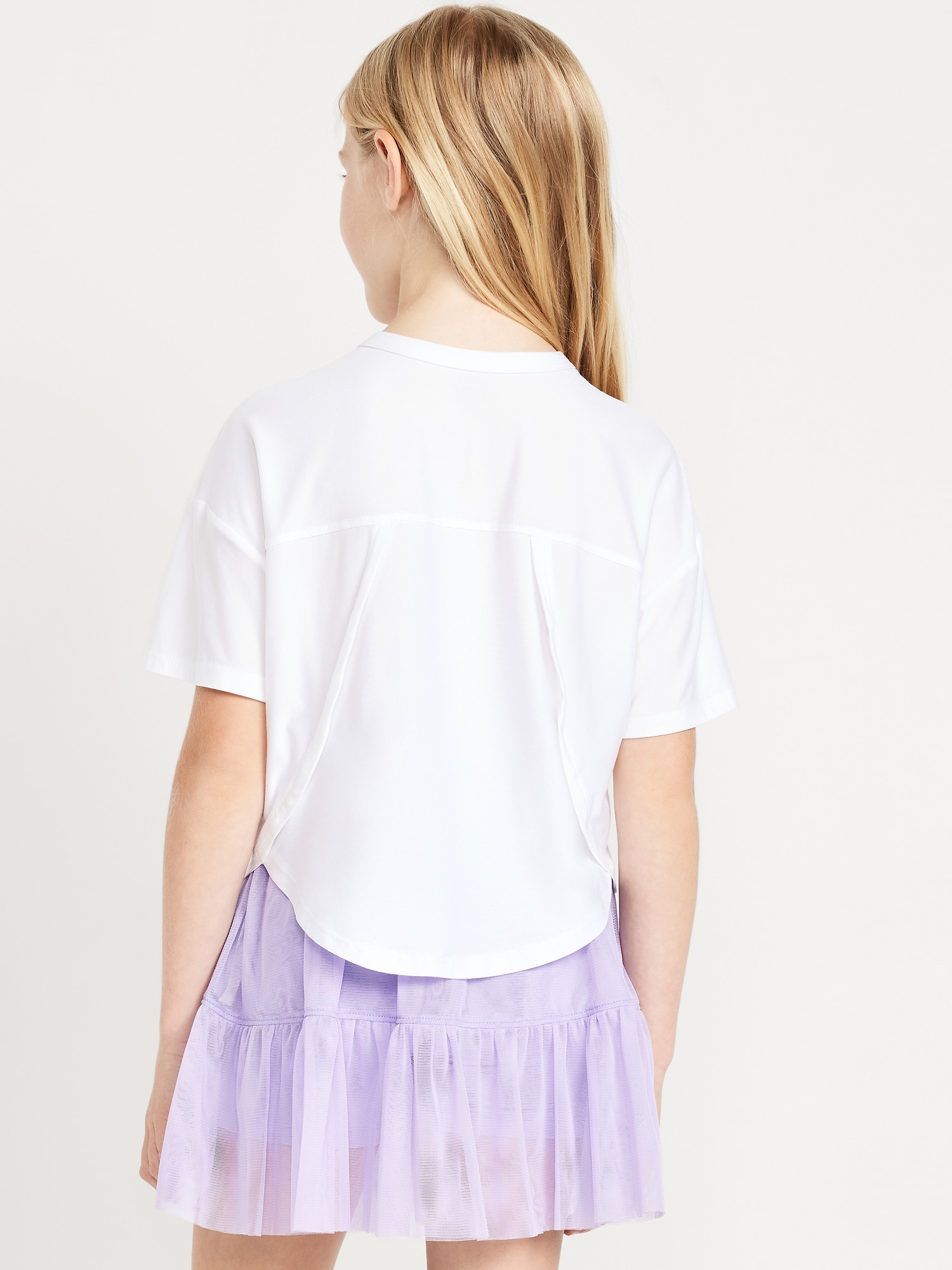 CloudMotion Cropped Performance T-Shirt for Girls: crew neck, short sleeves, drop shoulders, tulip hem, slightly cropped, #694626