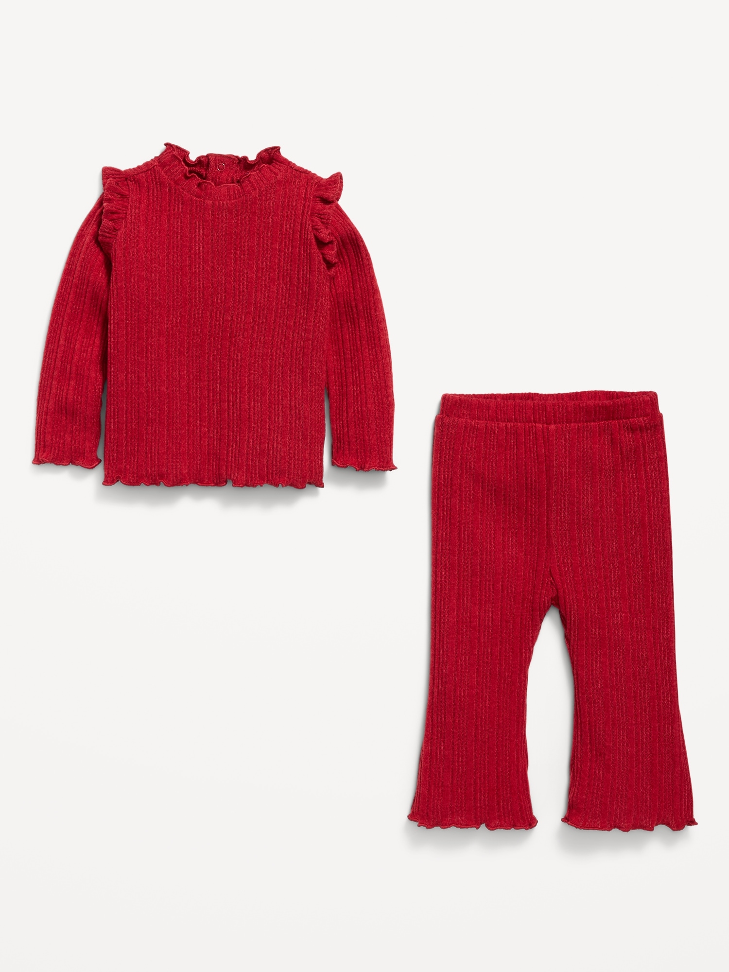 Cozy Long-Sleeve Ribbed Ruffle-Trim Top and Pants Set for Baby