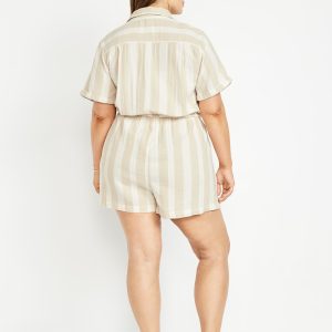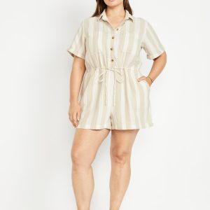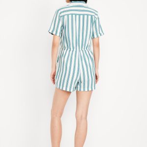 Crinkle Gauze Button-Down Romper: A light, rippled fabric that’s begging to be beachside.spread collar, short sleeves with rolled cuffs, button front, elastic waist with functional tie, patch chest pockets, diagonal front pockets, shirred detail, #705713