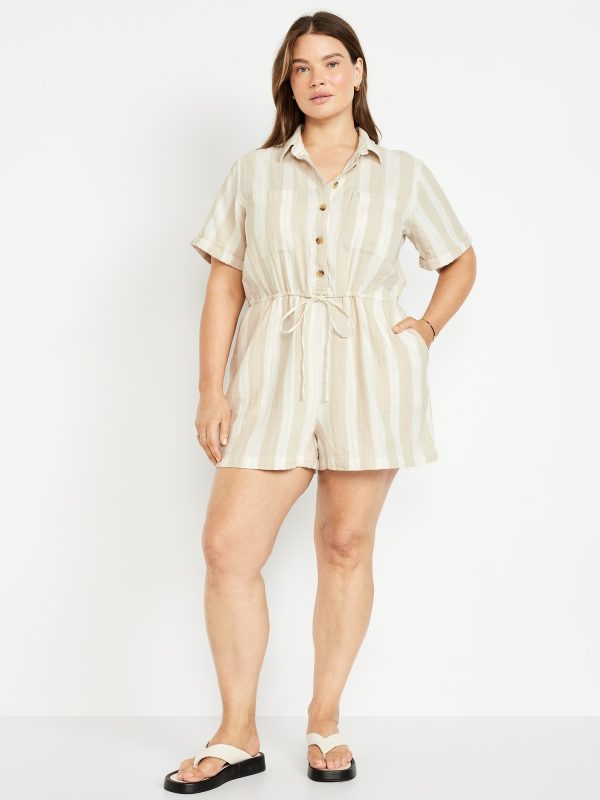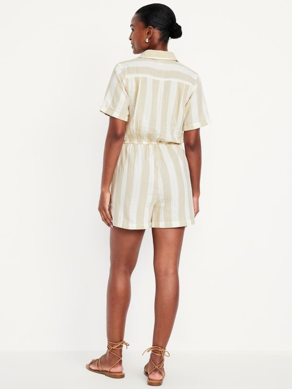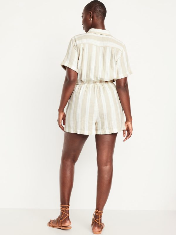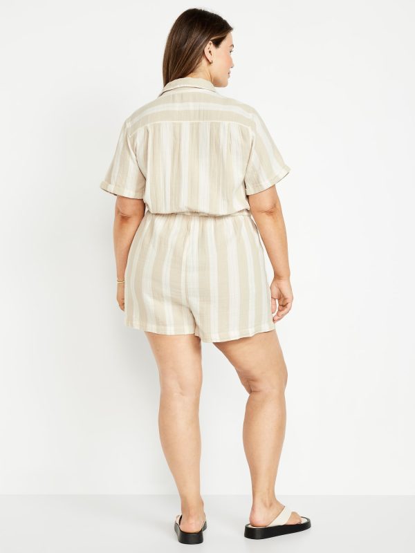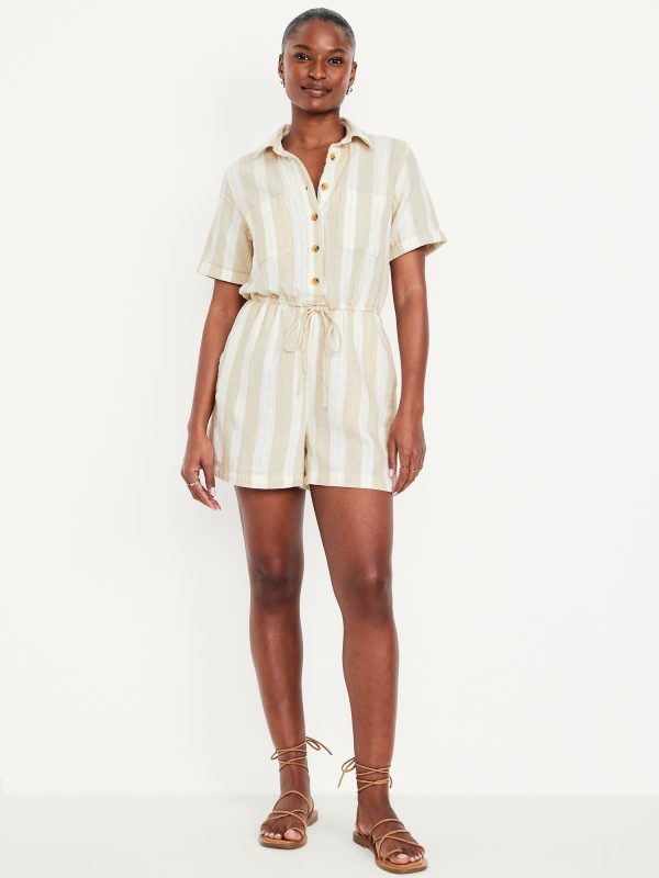 Crinkle Gauze Button-Down Romper: A light, rippled fabric that’s begging to be beachside.spread collar, short sleeves with rolled cuffs, button front, elastic waist with functional tie, patch chest pockets, diagonal front pockets, shirred detail, #705713