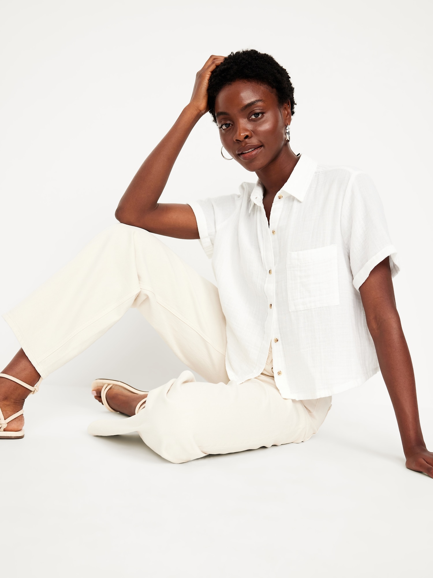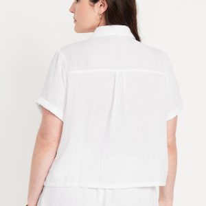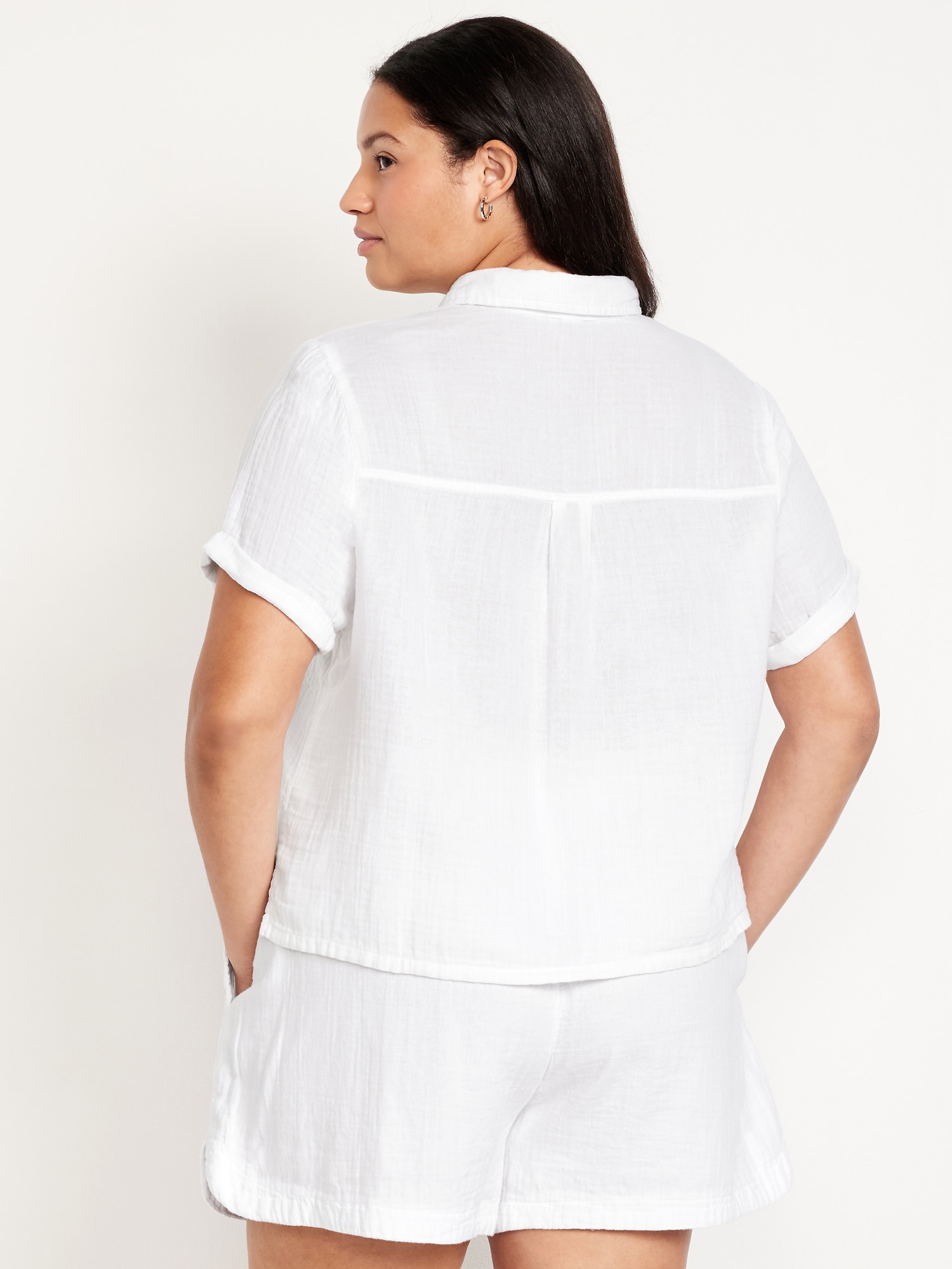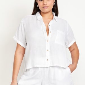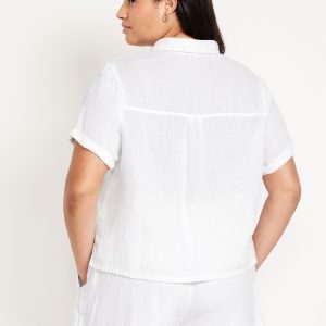 Crinkle Gauze Loose Button-Down Shirt: Drapey, laid-back and ready for the breeze.spread collar, short sleeves, full-button front, seamed back yoke, #704203