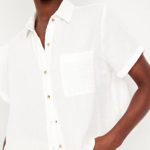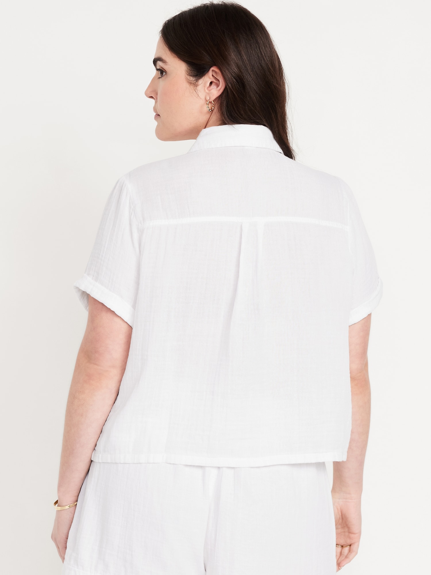Crinkle Gauze Loose Button-Down Shirt: Drapey, laid-back and ready for the breeze.spread collar, short sleeves, full-button front, seamed back yoke, #704203