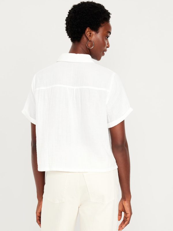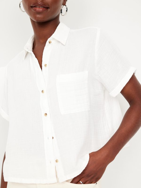 Crinkle Gauze Loose Button-Down Shirt: Drapey, laid-back and ready for the breeze.spread collar, short sleeves, full-button front, seamed back yoke, #704203