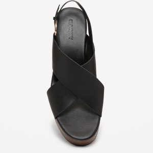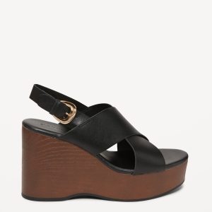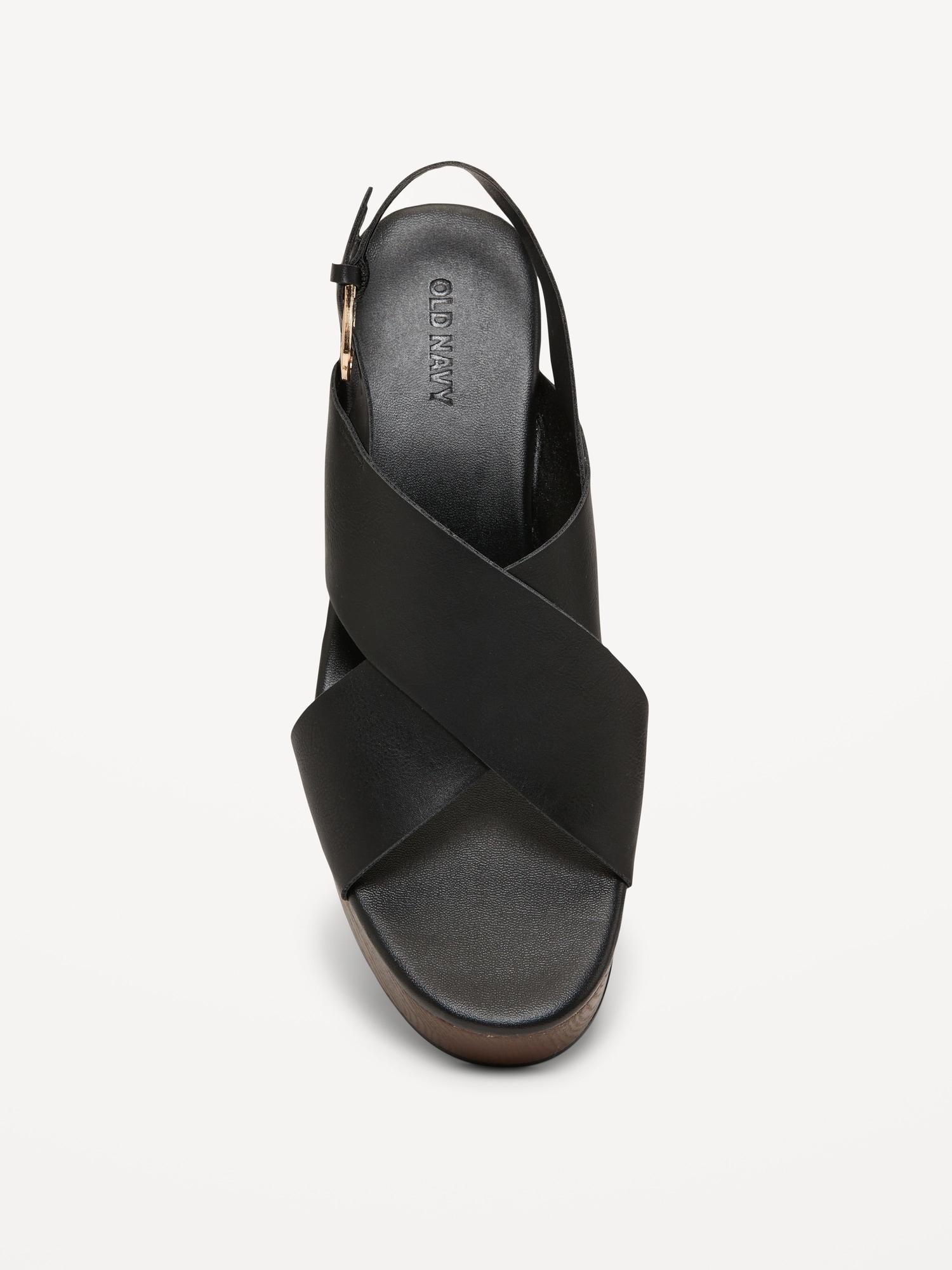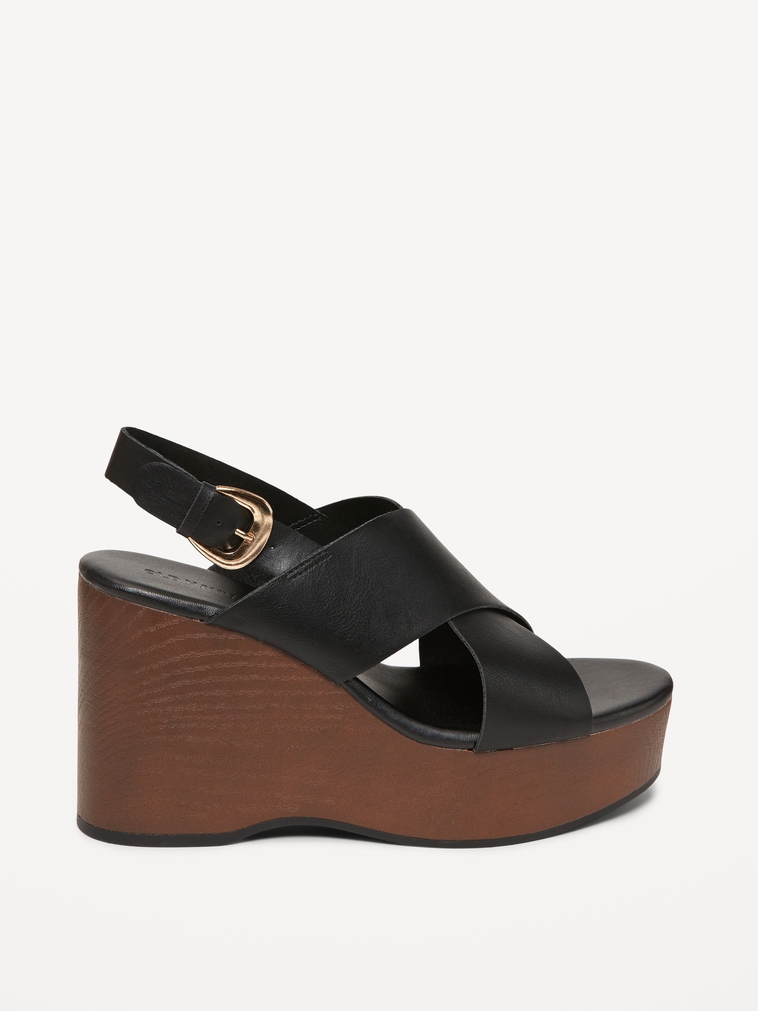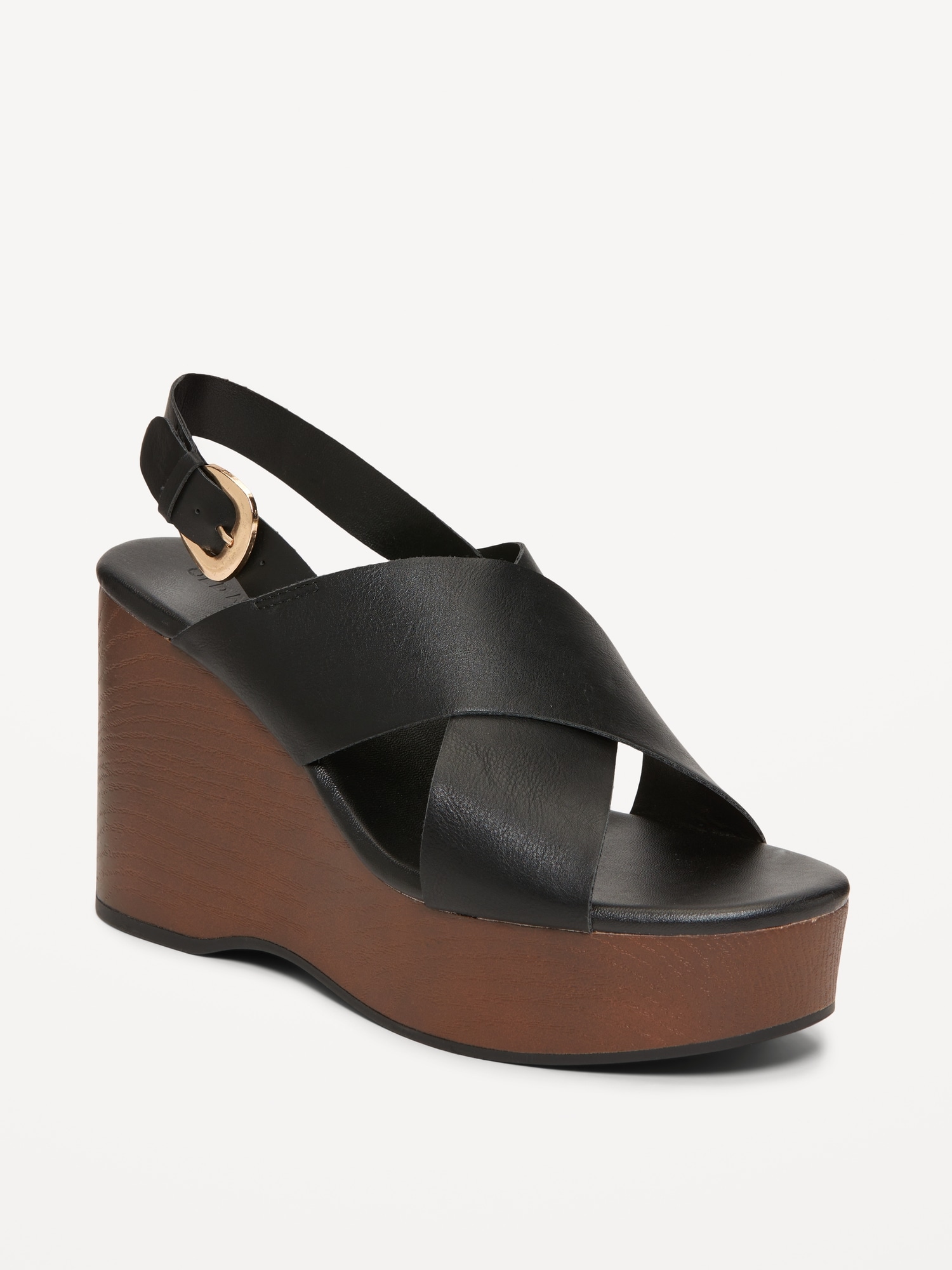 Crisscross Wedge Sandals for Women: faux leather upper, buckle fastening at ankle, platform wedge heel, cushioned foot bed, #750859