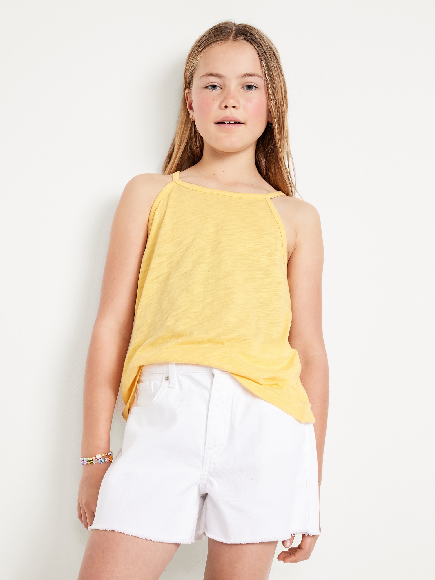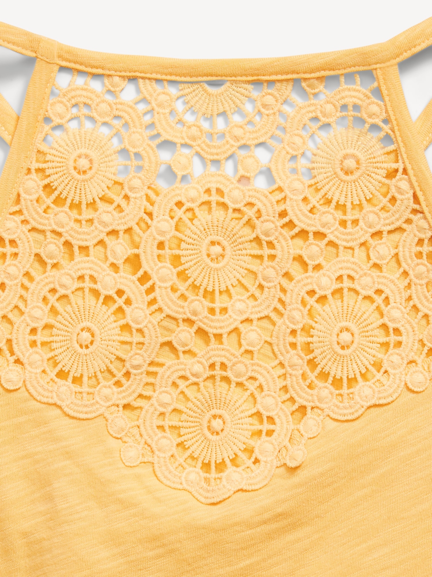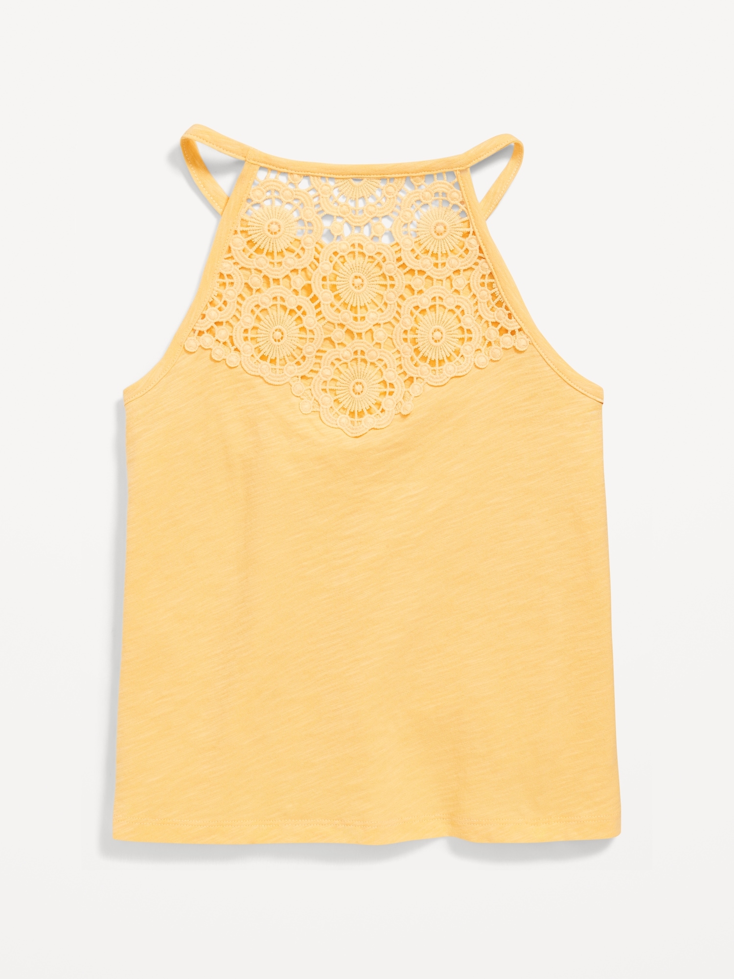 Crochet Back Halter Tank Top for Girls: round neckline, sleeveless, button closure and keyhole cutout at nape, crochet knit trim along neckline and sleeve cuffs, rounded hem, #767961