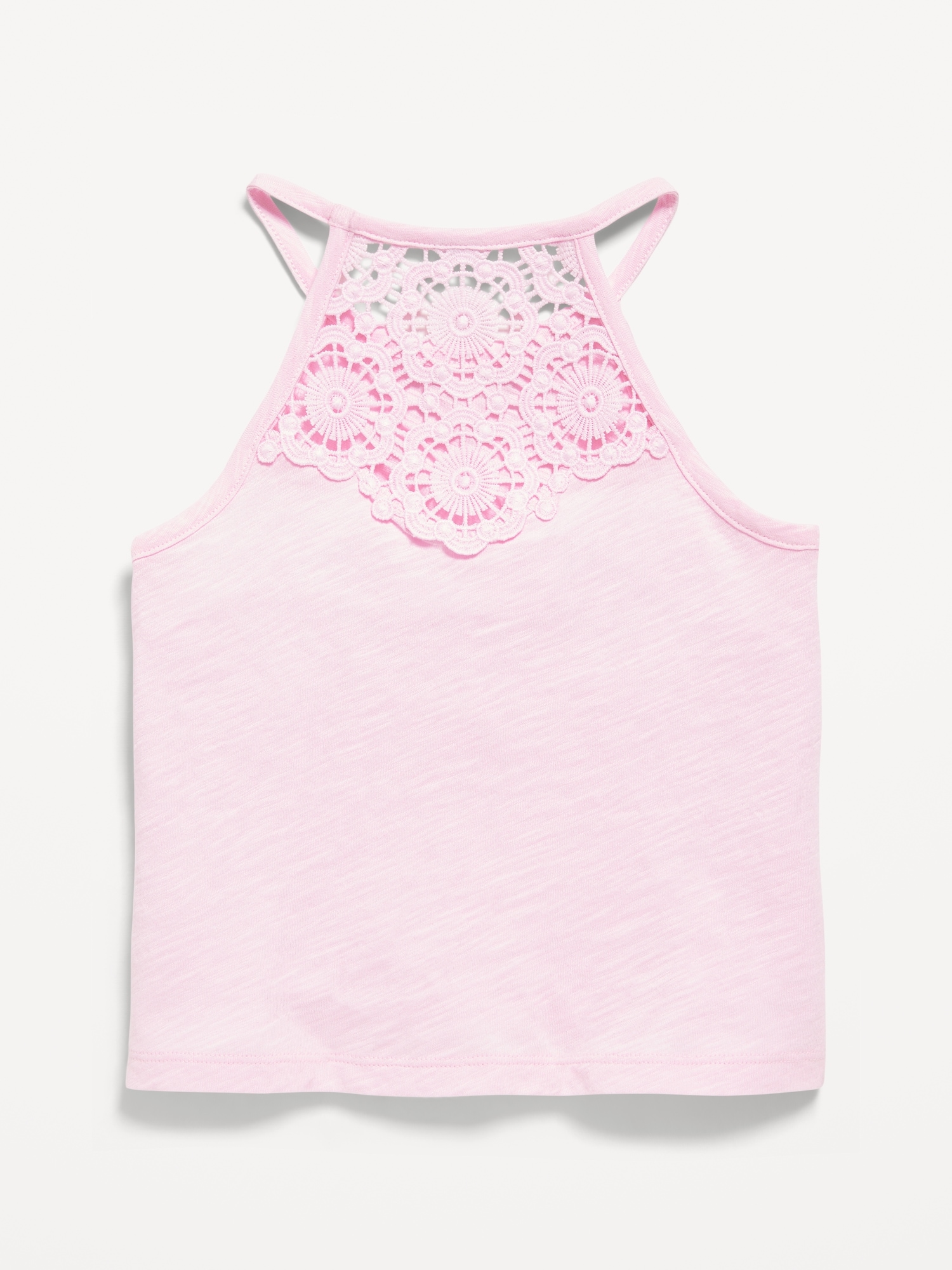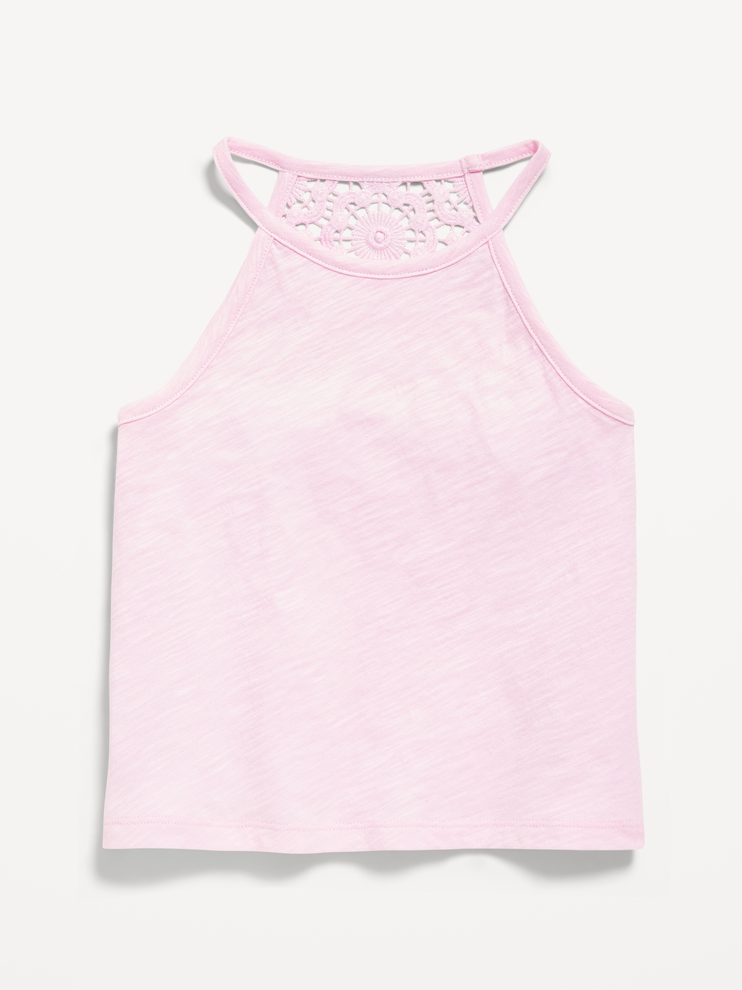 Crochet Back Halter Tank Top for Girls: round neckline, sleeveless, button closure and keyhole cutout at nape, crochet knit trim along neckline and sleeve cuffs, rounded hem, #767961